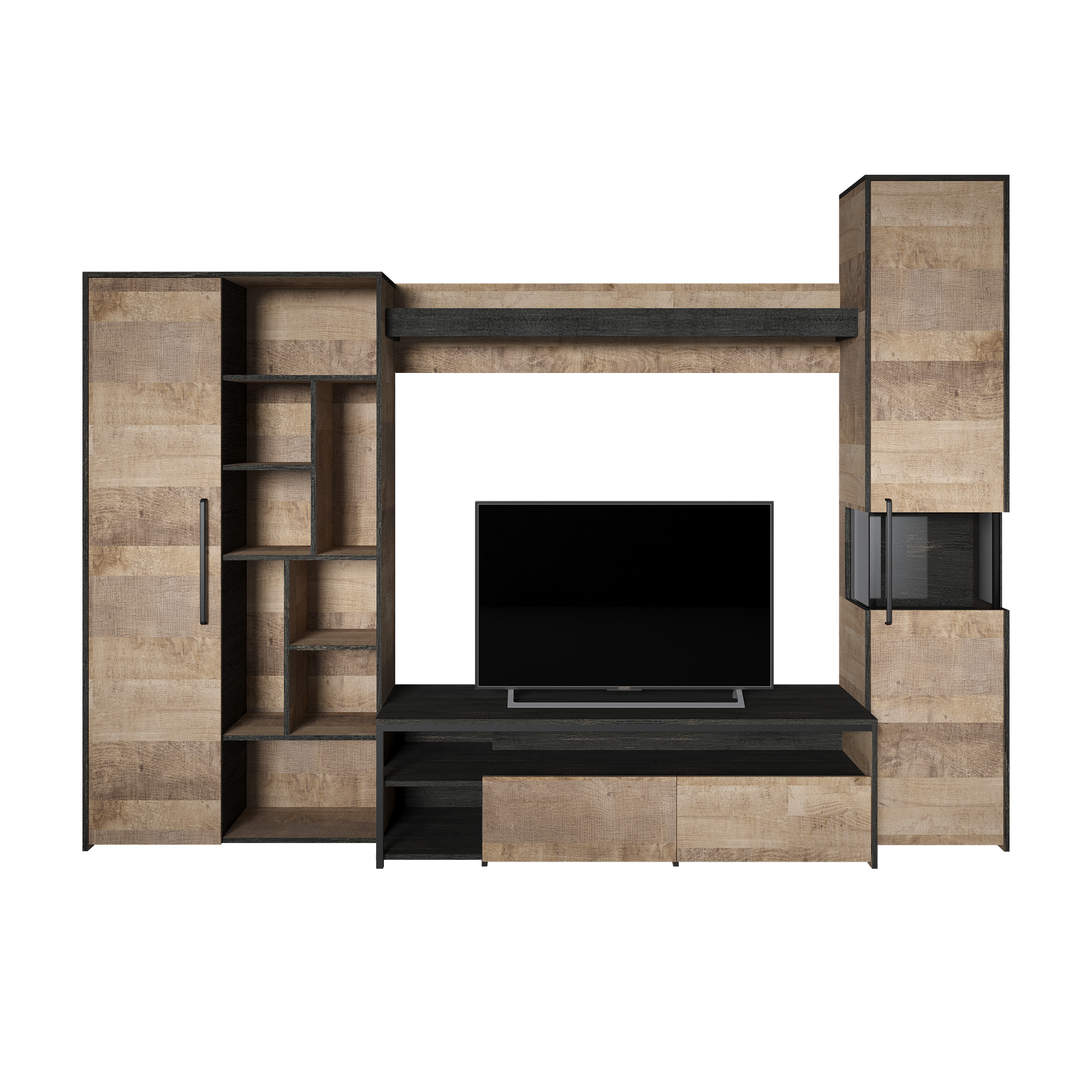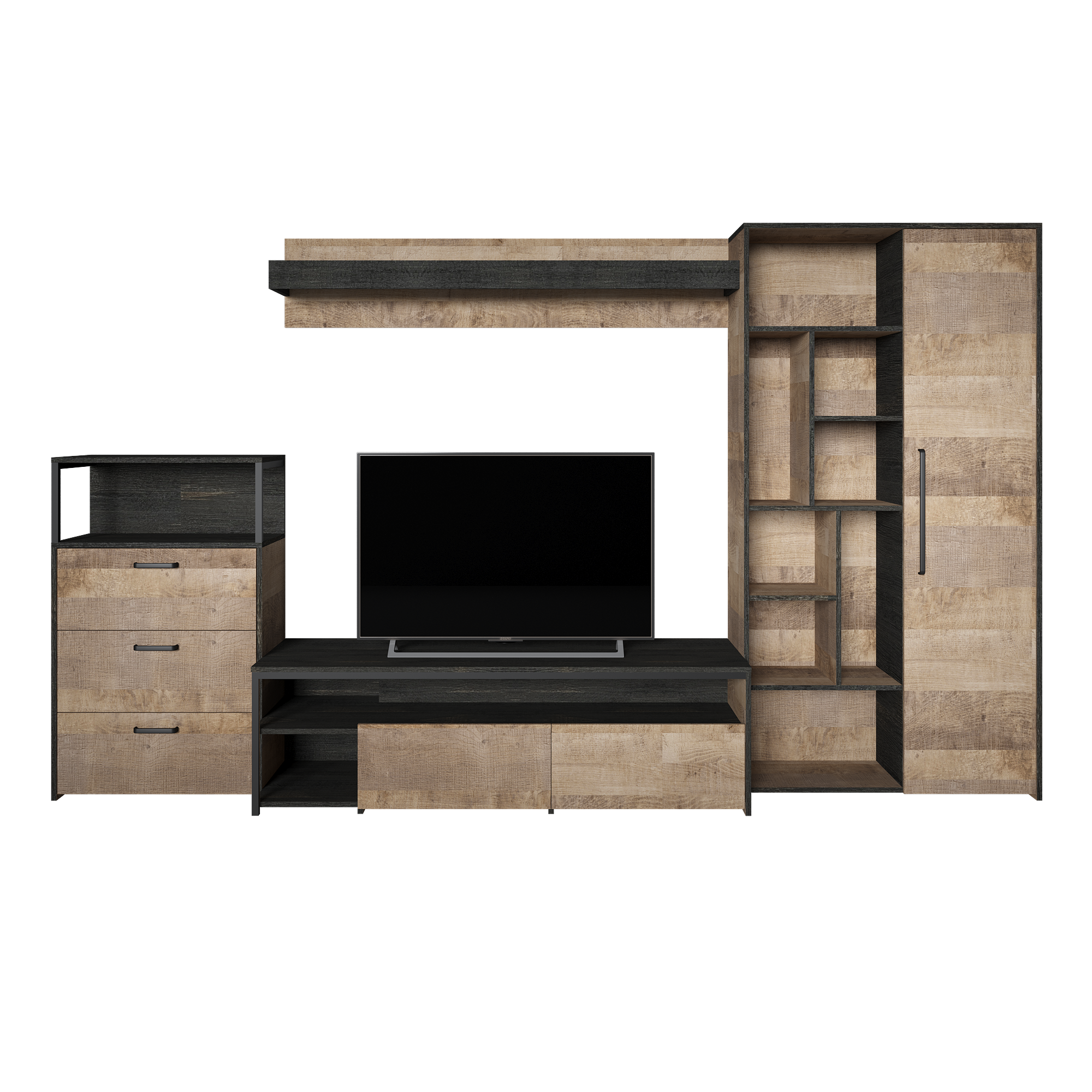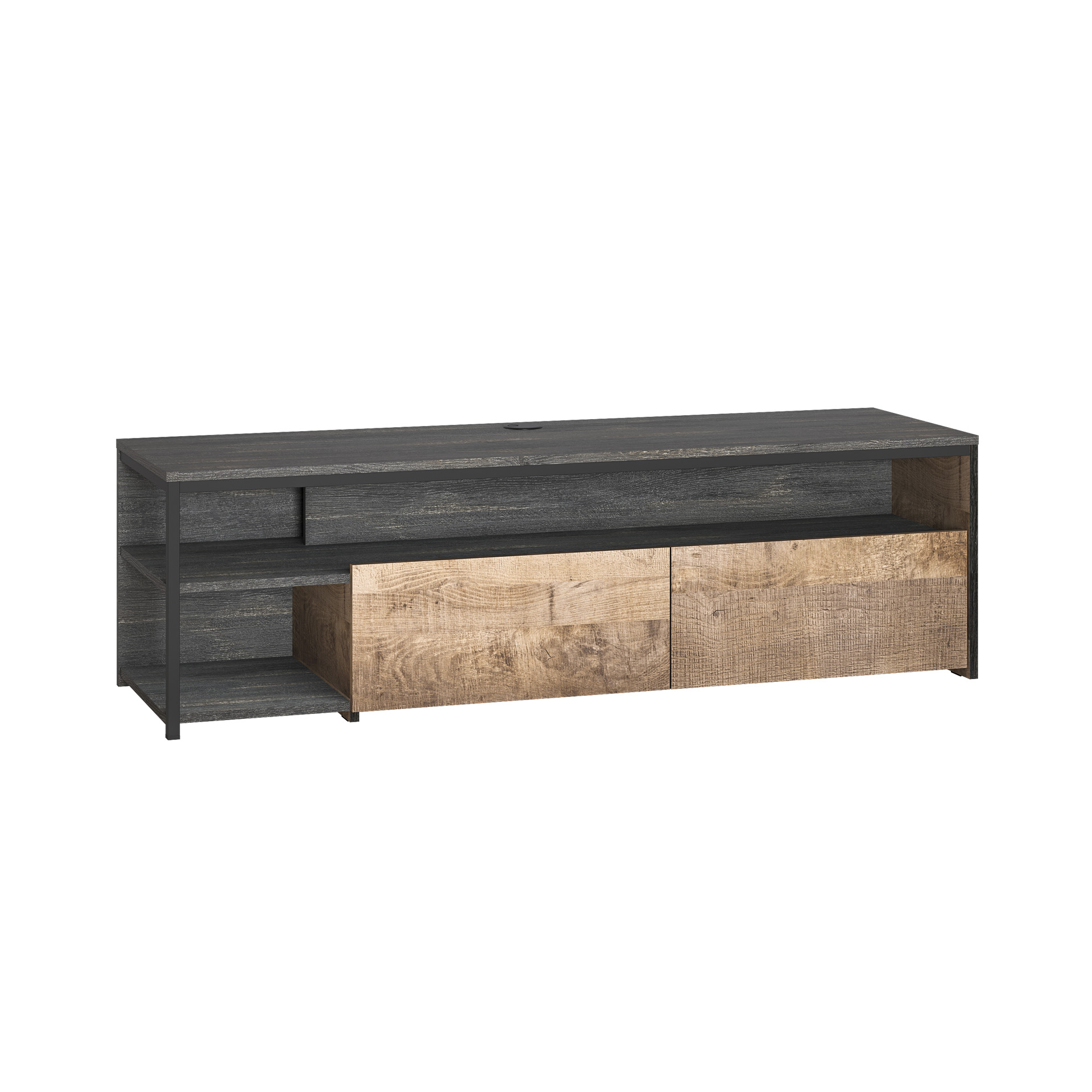 Лицевая фурнитура с тем же покрытием придаёт мебели индустриальную эстетику.