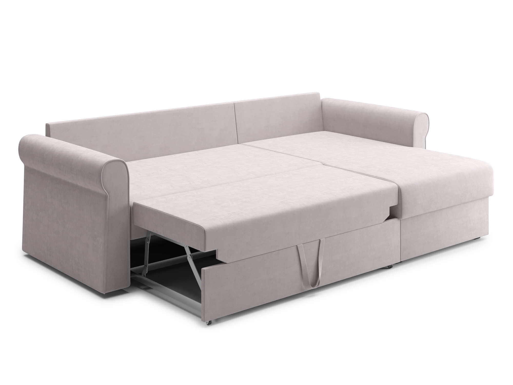 - Механизм раскладки дельфин — основан на выкатывании дополнительной платформы, скрытой под сидением дивана. Чтобы разложить диван, нужно потянуть за специальные ремешки, помогающие перемещать элементы конструкции. В результате этого действия нижняя часть дивана начнёт перемещаться. Делать это нужно до тех пор, пока часть не выдвинется максимально вперед. Затем следует немного приподнять элемент и упереть в противоположную часть, которая осталась неподвижной. Под сиденьем дивана находится короб для хранения вещей и постельных принадлежностей.