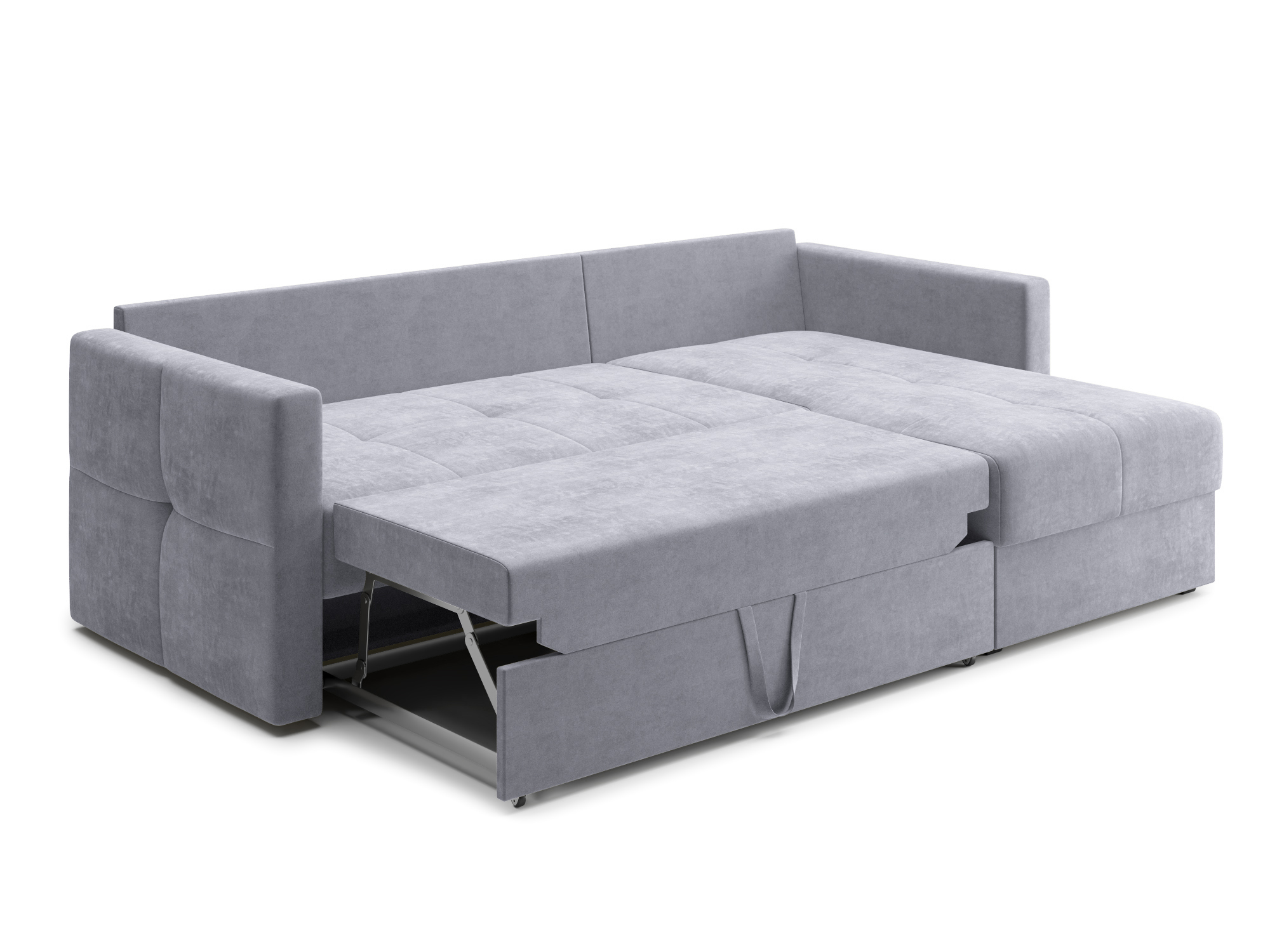 - Механизм раскладки дельфин – основан на выкатывании дополнительной платформы, скрытой под сидением дивана. Чтобы разложить диван, нужно потянуть за специальные ремешки, помогающие перемещать элементы конструкции. В результате этого действия нижняя часть дивана начнёт перемещаться. Делать это нужно до тех пор, пока часть не выдвинется максимально вперед. Затем следует немного приподнять элемент и упереть в противоположную часть, которая осталась неподвижной. Под сиденьем дивана находится короб для хранения вещей и постельных принадлежностей.