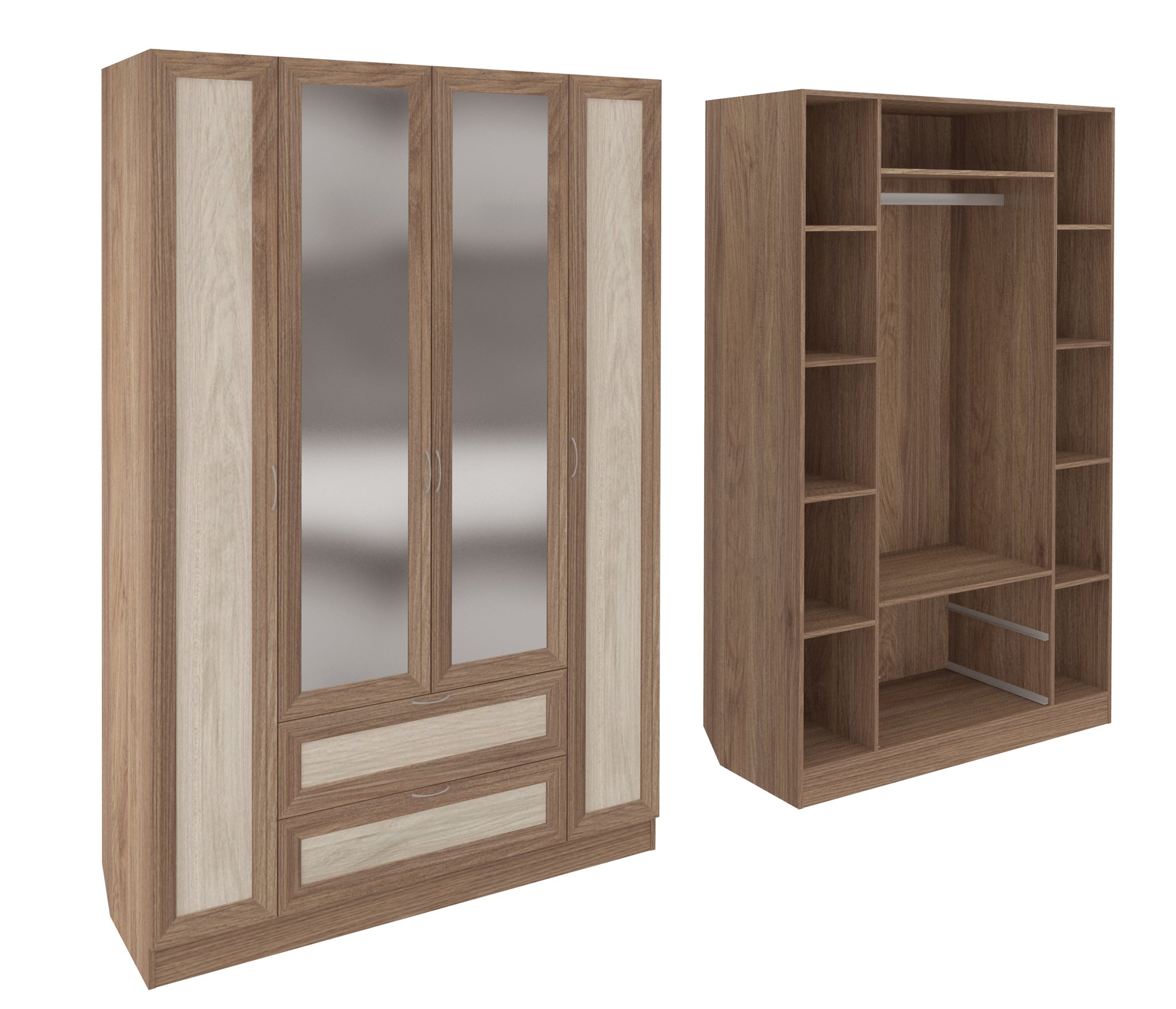 Корпус шкафа выполнен из Ламинированной ДСП высокого качества с насыщенным цветом. Фасады выполнены из материала МДФ.В данной моделе используются зеркала, которые внедрены в рамки фасадов.Шириною 140 см., красивый и удобный четырехстворчатый шкаф. По бокам слева и справа секции, по четыре полки в каждой. В центре сверху узкая ниша, под ней большая секция со штангой для одежды. В самом низу два выдвижных ящика. Два зеркала в данной моделе уже включены в стоимость.