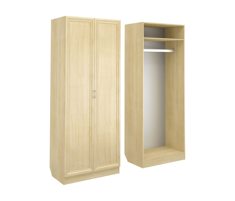 Корпус шкафа ШК-2 выполнен из Ламинированной ДСП высокого качества с насыщенным цветом. Фасады выполнены из материала МДФ.Шириною 80 см., это классический шкаф для верхней одежды, несет в себе следующие элементы. За распашными дверьми большая штанга, над ней ниша.