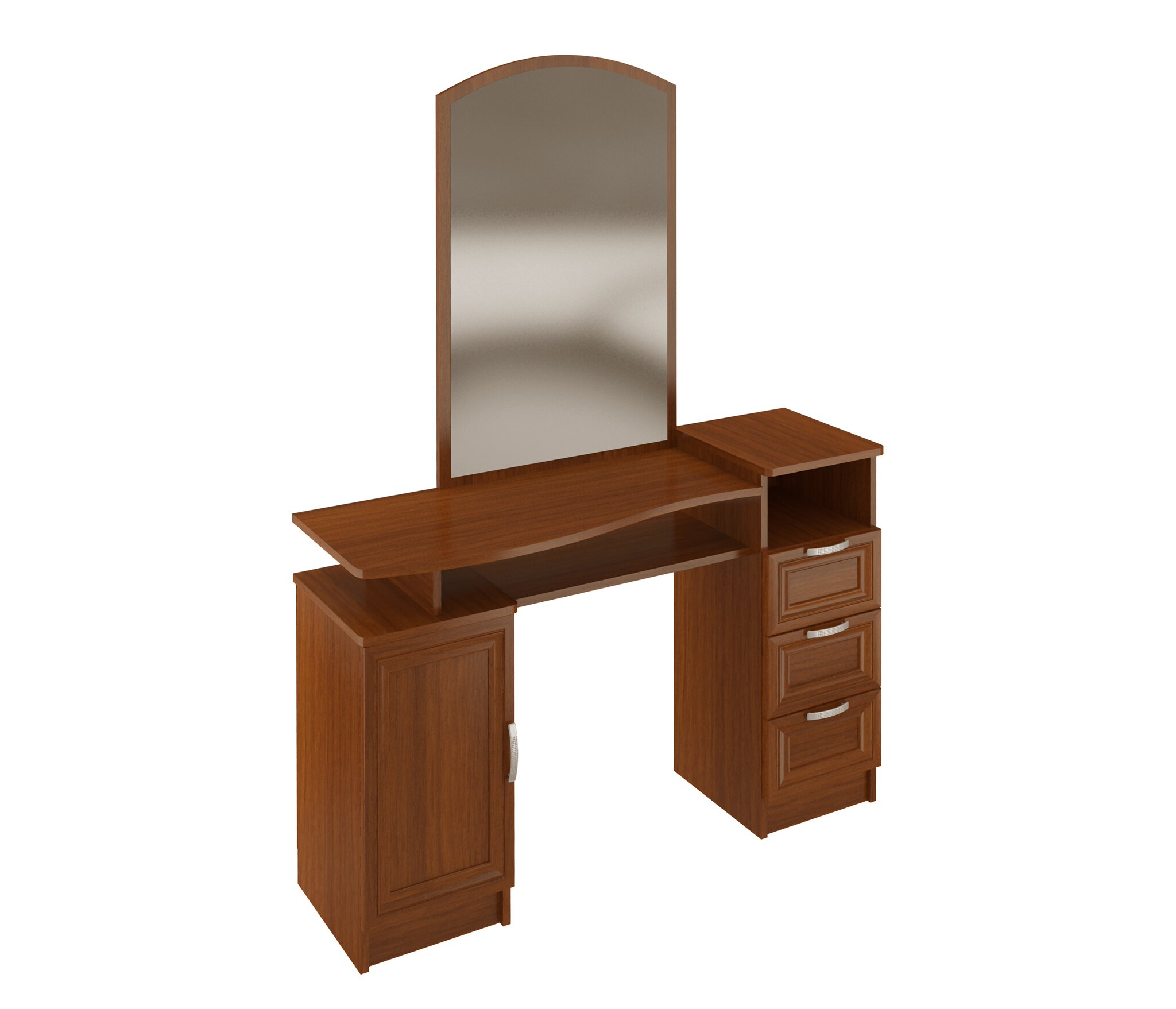 Корпус туалетного столика выполнен из Ламинированной ДСП высшего качества с насыщенным цветом. Рамка фасадов в плёнке МДФ.В комплект входит вся необходимая фурнитура.Удобный и функциональный в использовании.С дверцей с одной стороны и 3-мя выдвижными ящиками с другой стороны.
