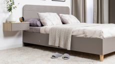 Подвесные консоли и велюровый пуф в тон фасадов дополняют сдержанный и благородный облик спальни Амьен.
