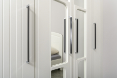 Визуально плита ДСП имеет глубокое тиснение шагрень, а белый цвет фасадов удачно подчёркивает его.