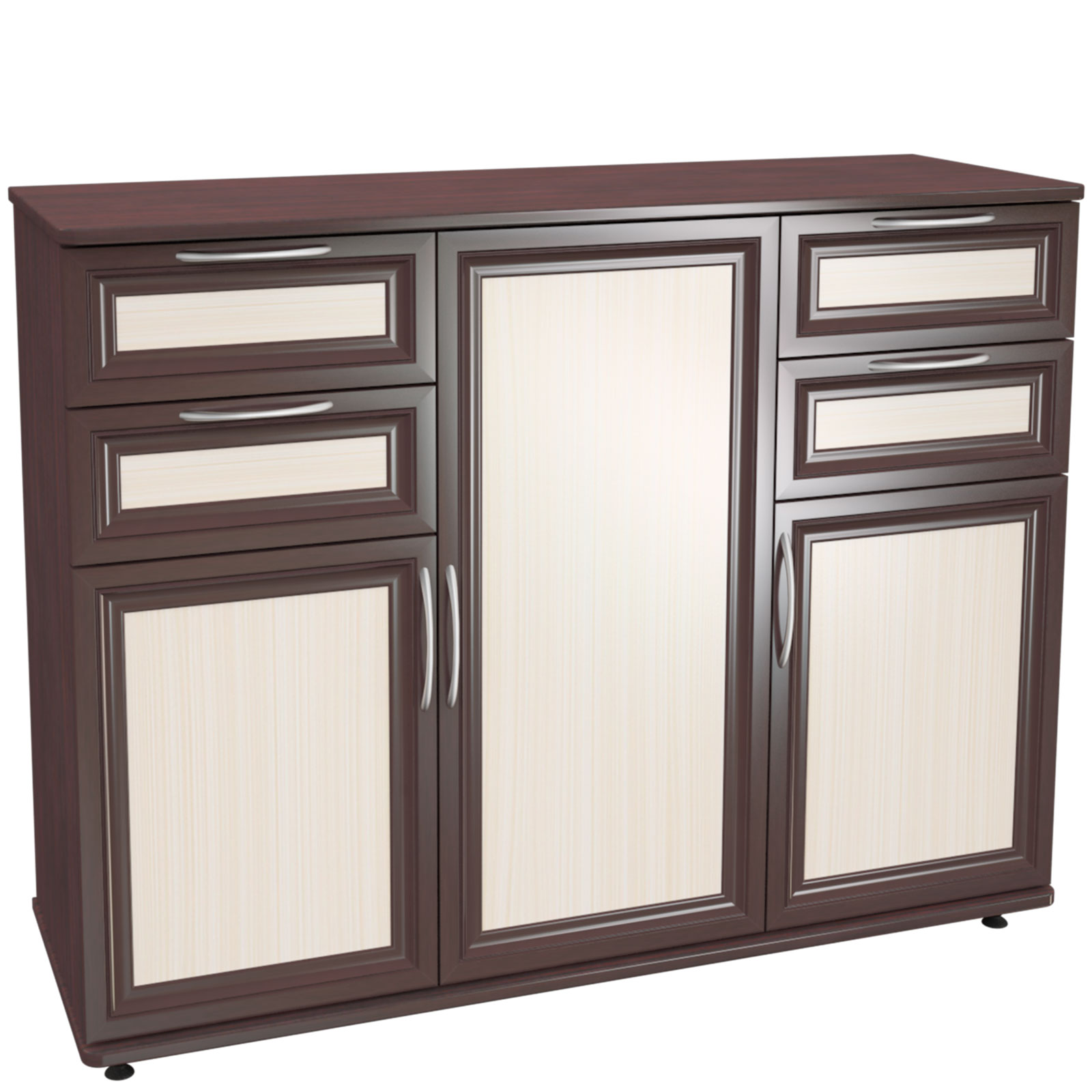 Комод 3 отличается многофункциональностью и большими размерами.оснащён выдвижными ящиками и дверками,скрывающими полки.Ножки из пластика,корпус ЛДСП,фасады рамочные МДФ.