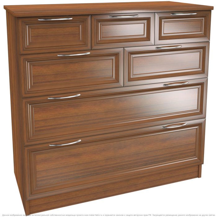 Комод 21 отличается большими размерами и многофункциональностью в использовании.Два нижних ящика больших размеров,остальные 5 размером меньше,что позволяет размещать вещи разной габаритности.Корпус ЛДСП,фасады рамочные МДФ.Производитель оставляет за собой право менять фурнитуру.