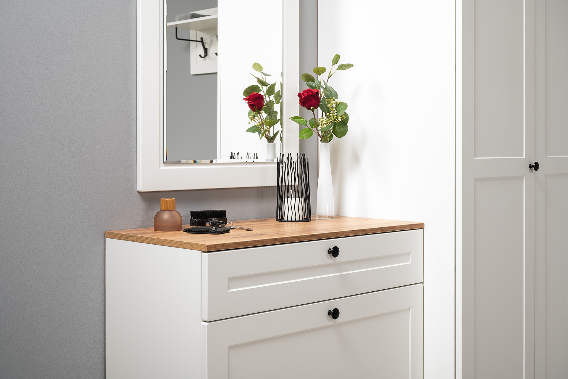 Вместительная шкафная группа позволит оптимально организовать хранение, а продуманные габариты тумбы, комода и зеркала дают возможность собрать различные компоновки.