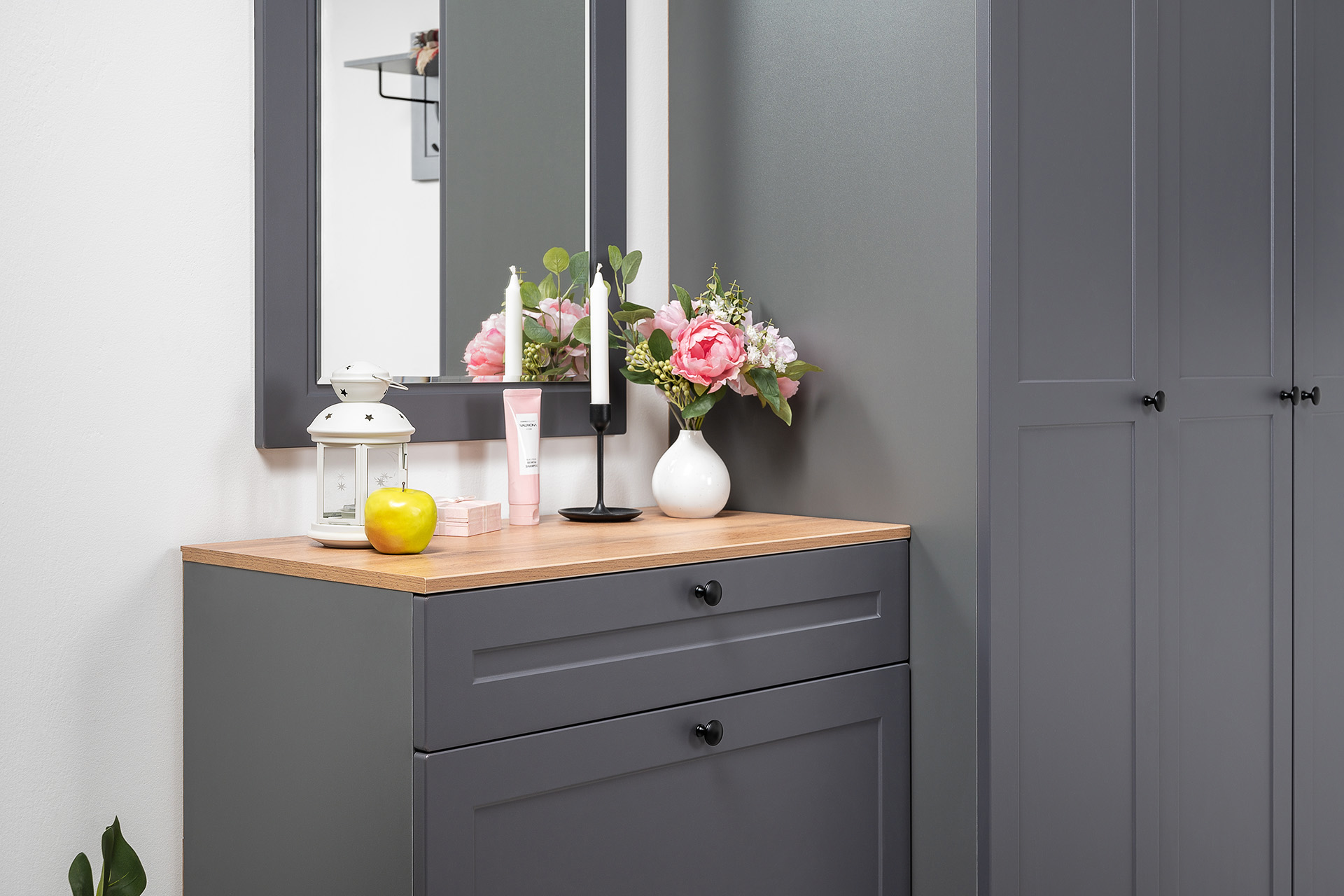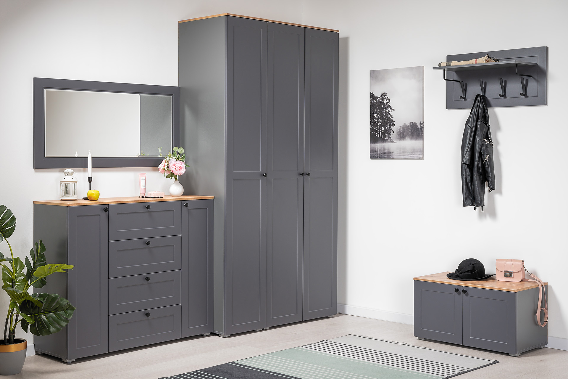 Вместительная шкафная группа позволит оптимально организовать хранение, а продуманные габариты тумбы, комода и зеркала дают возможность собрать различные компоновки.