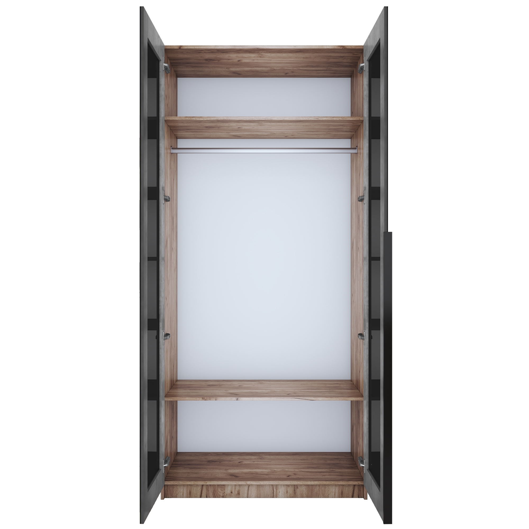 Фасады шкафа изготовлены из стекла черного цвета, оклеенного противоосколочной пленкой с внутренней рамкой из ЛДСП Бетон.