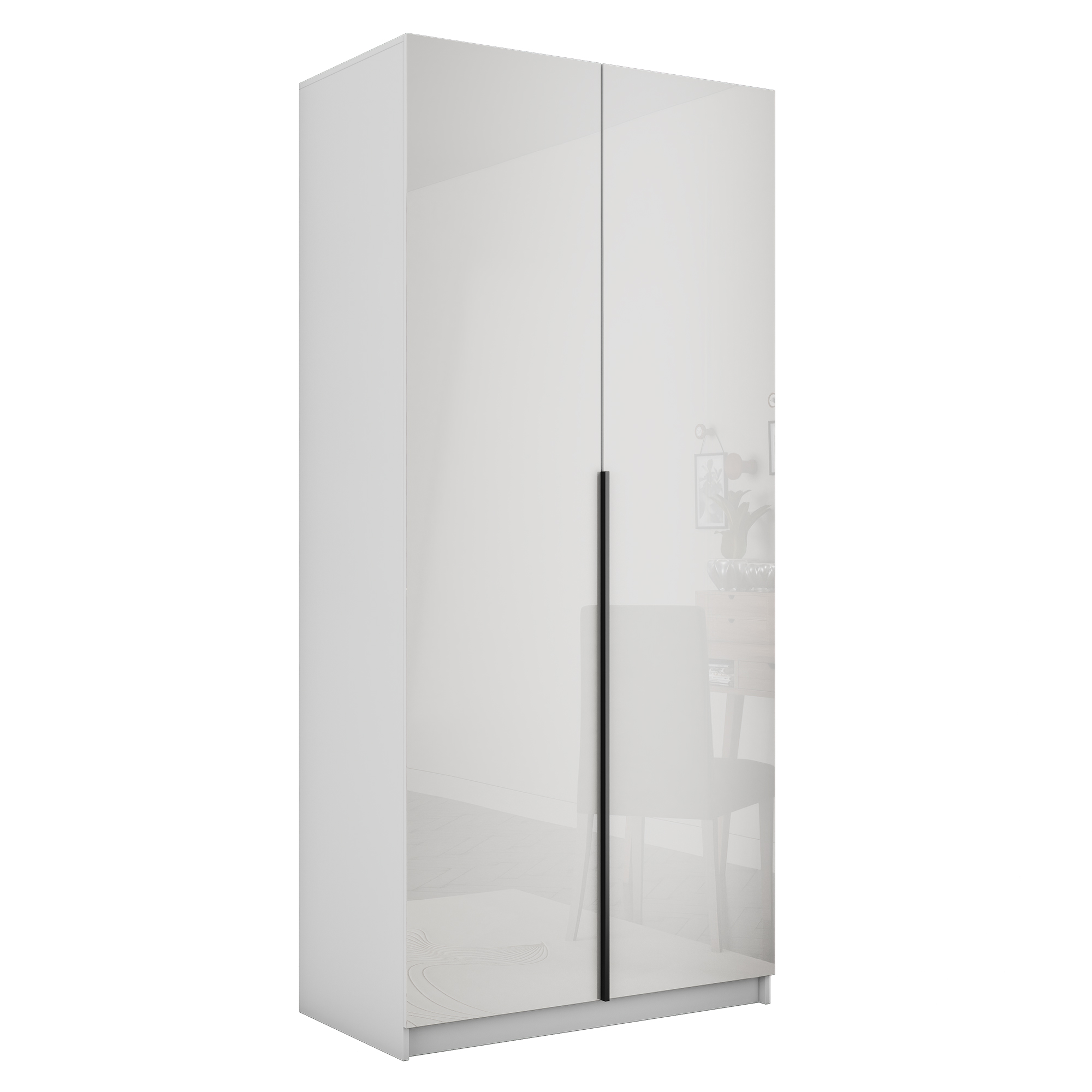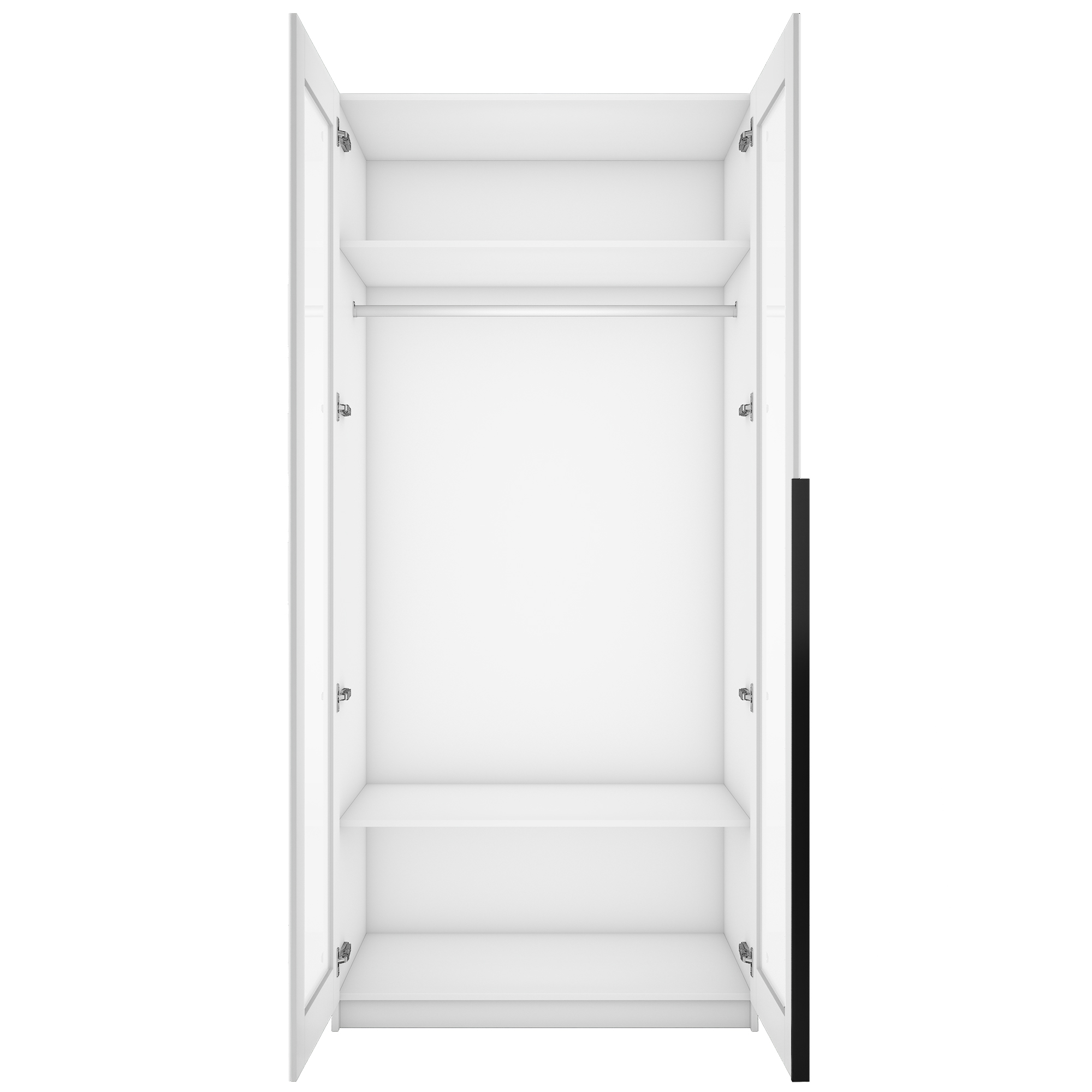 Фасады шкафа изготовлены из стекла белого цвета, оклеенного противоосколочной пленкой с внутренней рамкой из ЛДСП Белый снег.