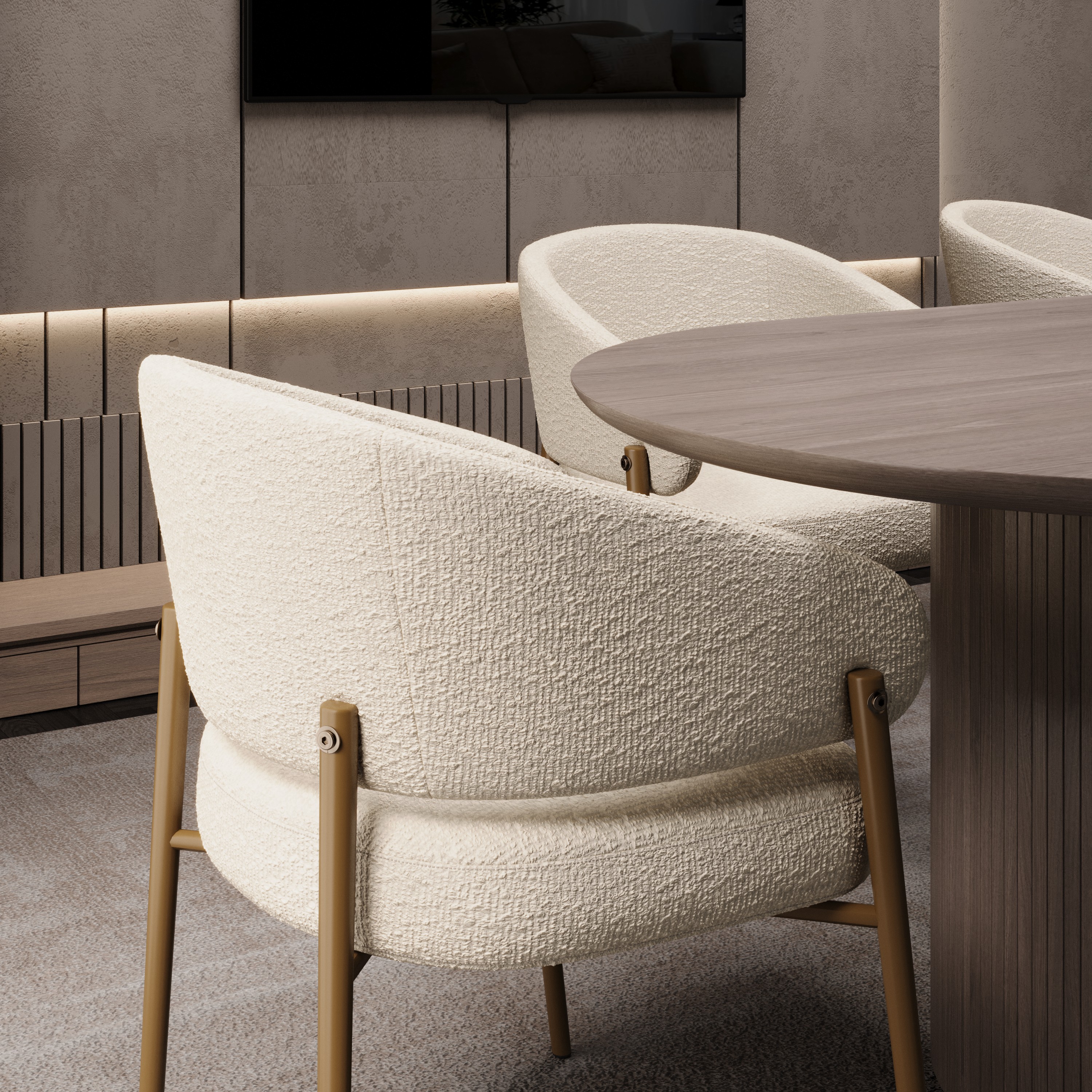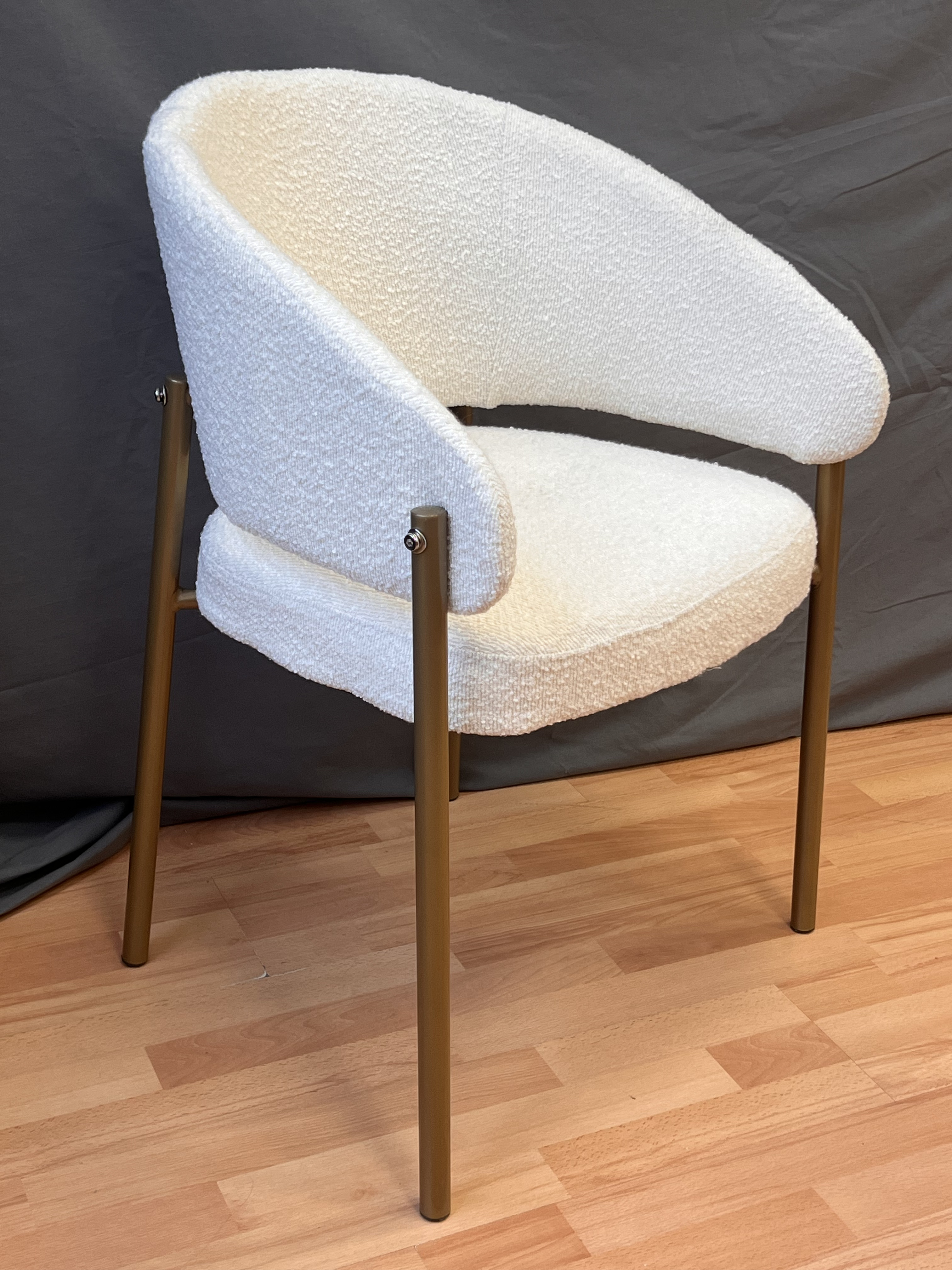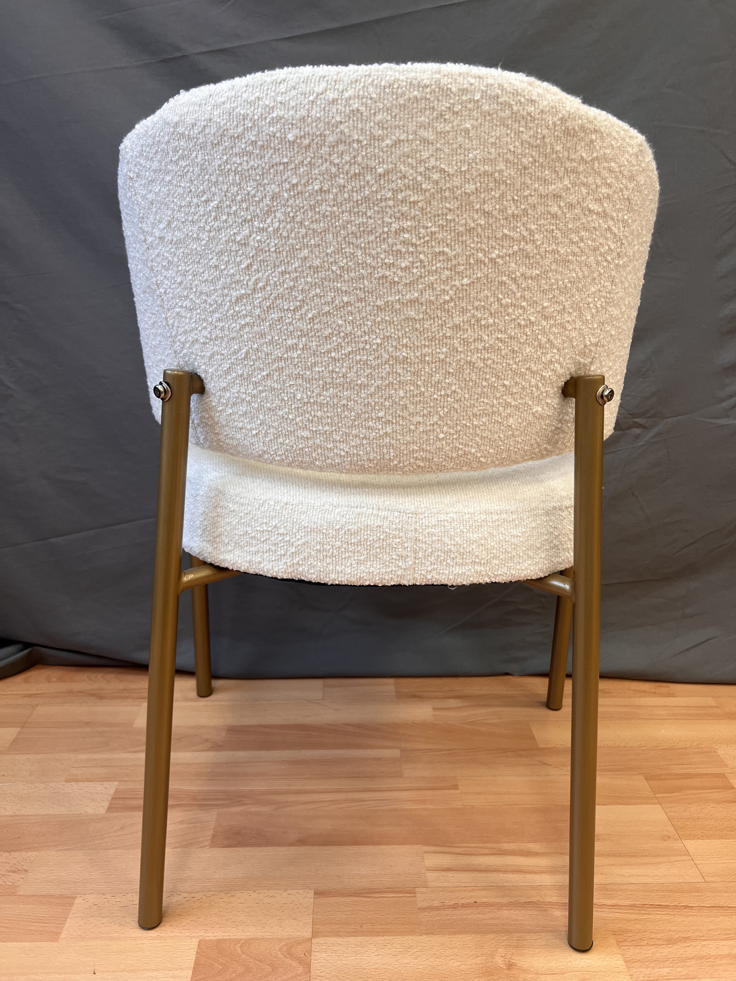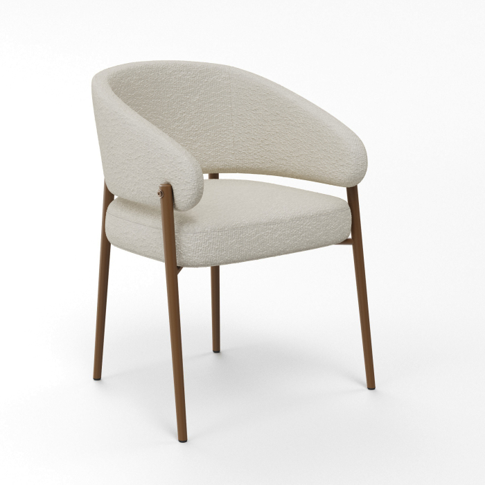 Кресло выполнено в бежевом цвете с золотистыми акцентами, что придает ему изысканный и современный вид. Обивка из букле, обеспечивает мягкость и комфорт при использовании.