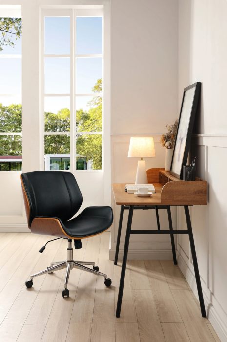 Корпус кресла выполнен из гнутой тонированной фанеры в насыщенном коричневом цвете, что придает ему нотку тепла и элегантности. Черная искусственная кожа обивки добавляет современности и изысканности, легко вписываясь в любой офисный интерьер.