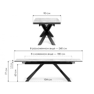 Керамический стол Хеме — это стильный и функциональный предмет мебели, который отлично подойдет для обустройства как интерьера, так и экстерьера. Его размеры 180(240)х90х77 см делают его достаточно просторным для размещения нескольких человек. Расстояние между ножками в 104 см обеспечивает комфортное размещение стульев и удобство при использовании стола. Толщина столешницы в 1,5 см придает столу прочность и устойчивость, а керамическое покрытие делает его легким в уходе и устойчивым к повреждениям.