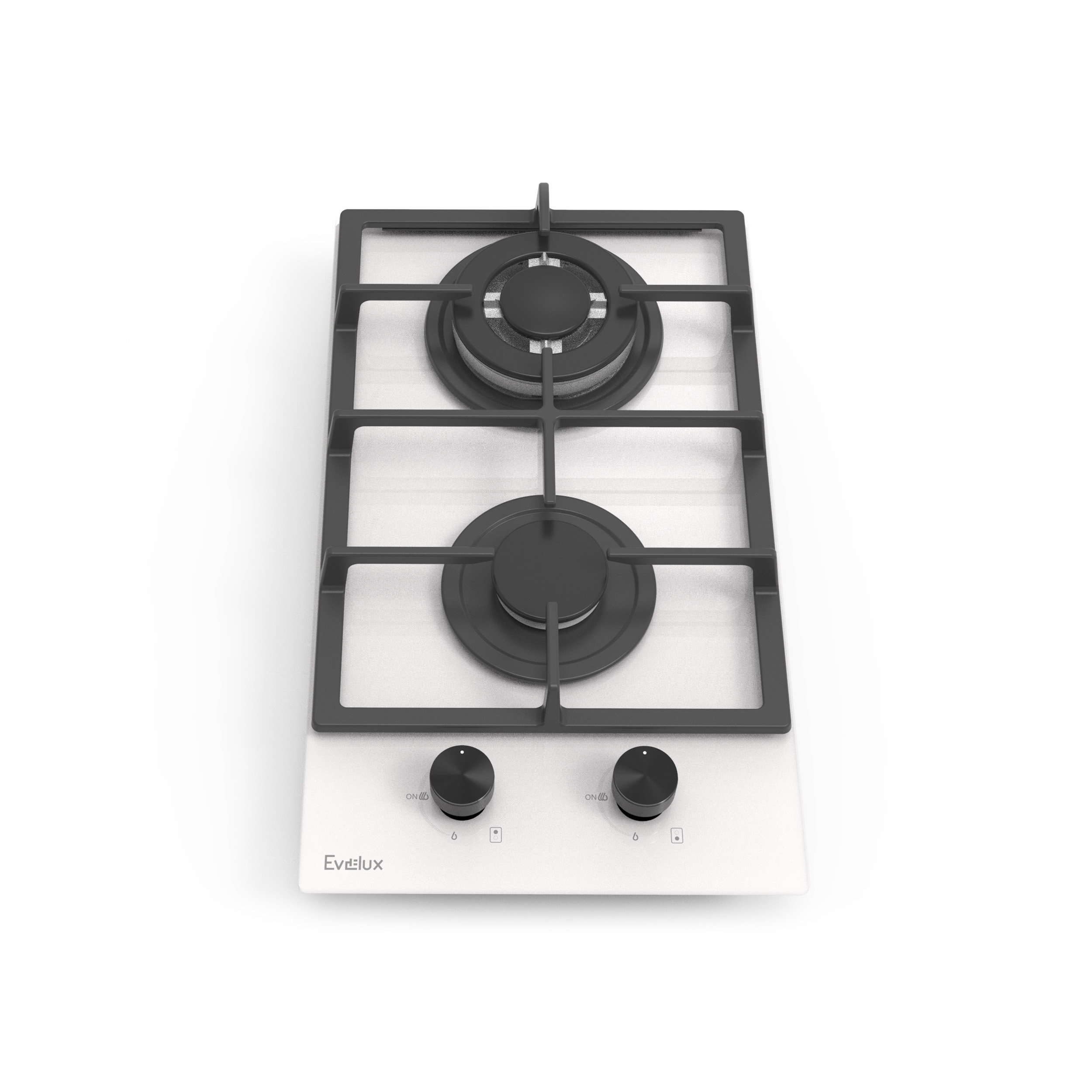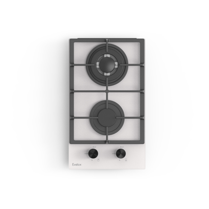 Варочная панель газовая, 30 см, 2 конфорки: экономичная конфорка (1 кВт), Вок конфорка (3,3 кВт), газ-контроль, электроподжиг, черное высокопрочное закаленное стекло, чугунные решетки, поворотные переключатели, комплект форсунок-переходников на балонный газ, 305х520х110 мм.