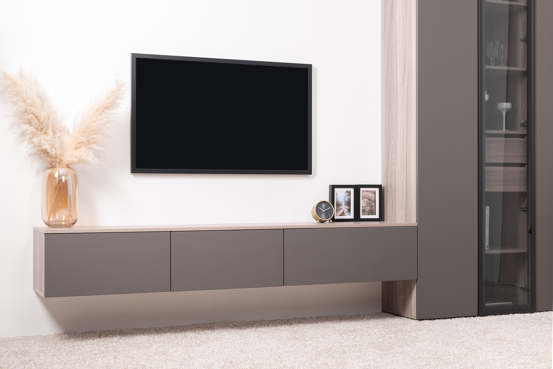 Разнообразие модулей и возможность их напольной и настенной установки позволит создать гостиную оптимальной конфигурации. Распашные фасады с механизмом push-to-open, направляющие скрытого монтажа в ящиках, петли с доводчиками, регулируемые опоры, крепеж в комплекте – комфорт продуман до мелочей.