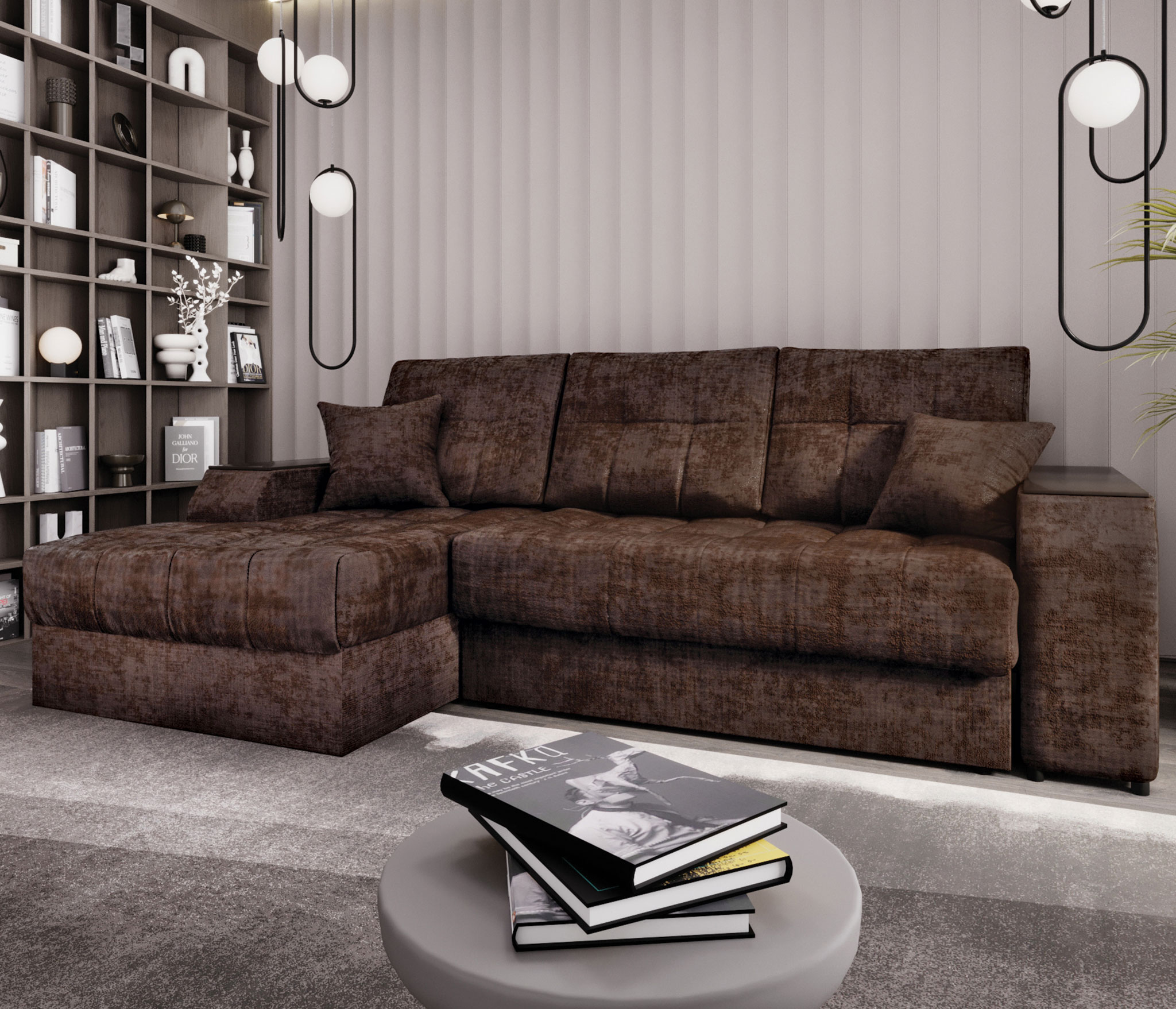 Оттоманка имеет оригинальную Г-образную форму, обтекающую подлокотник спереди. Это придаёт дивану изысканный вид и, когда диван установлен подлокотником к стене, отсутствует щель между оттоманкой и стеной, что удлиняет спальное место. Под декорами в подлокотниках скрыты два вместительных короба. В них можно хранить как постельное бельё, так и множество вещей, которым иногда сложно найти место, например, игрушки и даже инструменты. Мягкие приспинные подушки создают дополнительный комфорт во время сидения.Декоративные подушки при желании можно подложить под спину или голову. Задняя планка придаёт жёсткость конструкции и ограничивает соприкосновение со стеной во время сна.Благодаря утяжкам на сидении дивана ткань не растягивается и не собирается в складки.