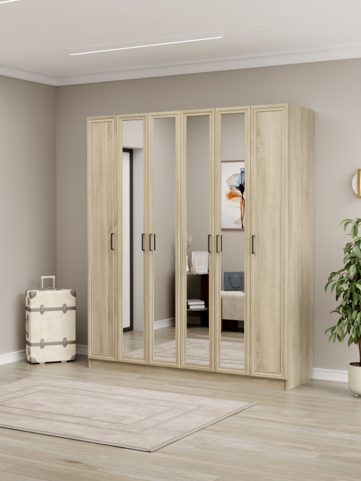 Шкаф имеет габариты: ширина — 180 см, глубина — 52 см, высота — 210 см. Фасады выполнены из МДФ, корпус изготовлен из ЛДСП. Конструкция предусматривает шестистворчатое исполнение. Внутри расположено отделение с горизонтальной штангой для белья, допустимая нагрузка на которую составляет до 10 кг. Также в шкафу предусмотрены 16 полок для размещения вещей, коробок или иных предметов.