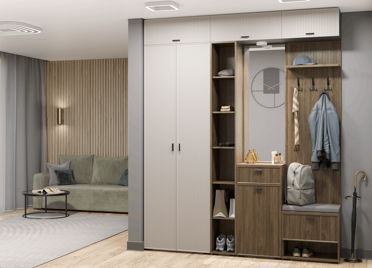 Отзывы о Столплит Модульная прихожая Стелла композиция 3 Серый Кашемир ребристый/Гикори Темный ребристый