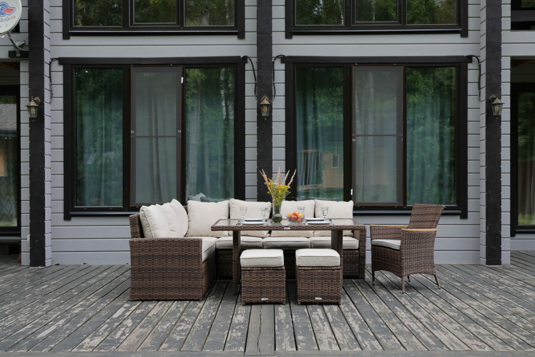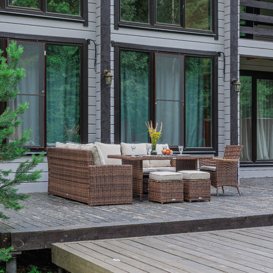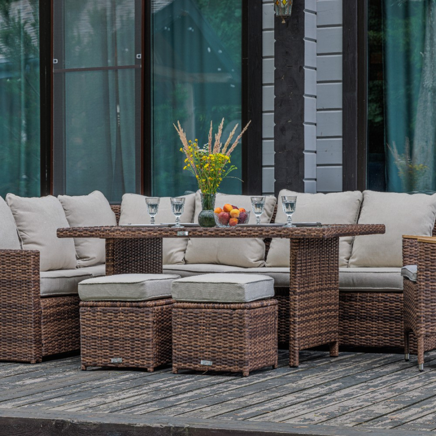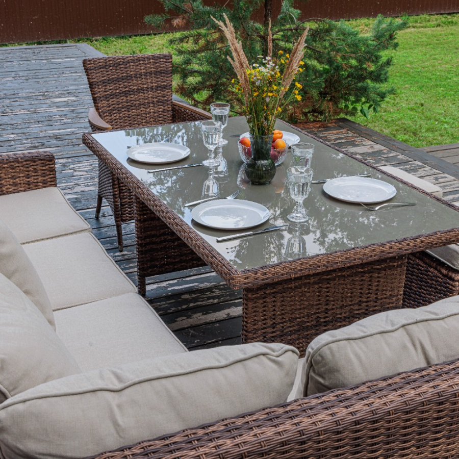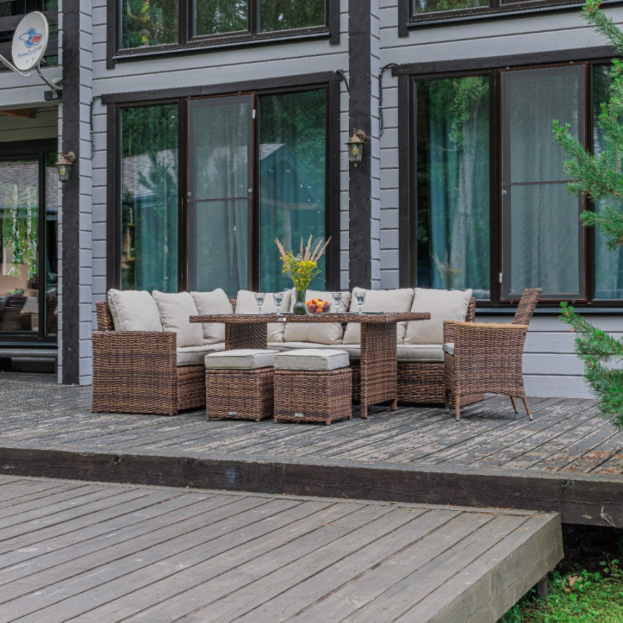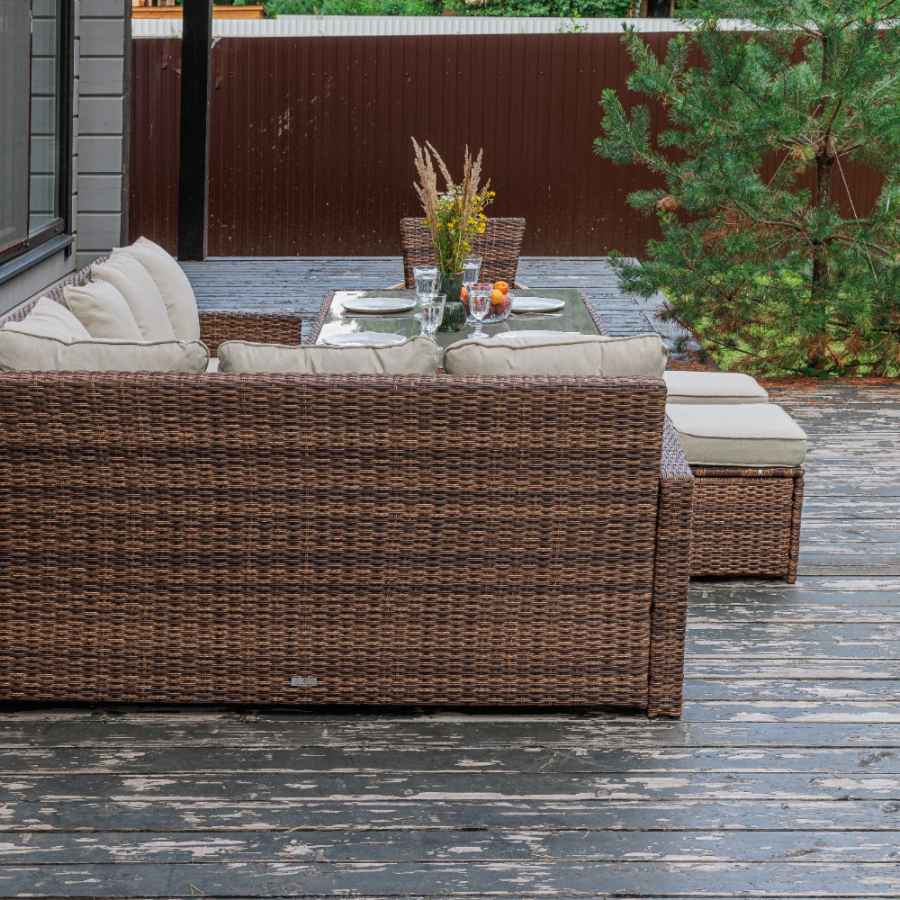Комплектация и габариты: Диван прямой - 171x71x81 см Диван угловой- 183x71x81 см Кресло - 60х59х87 см Обеденный стол - 150x90x70 см Пуф (2 шт) - 40x40x33 см Подушки под спину (7 шт) - 53х48х22 см Подушки для сиденья (6 шт) - 60х10х56 см Подушки для сиденья на кресло (1 шт) 47х7х44 см Подушка для сиденья на пуф (2 шт) - 40х10х40 см Материалы: Материал комплекта - искусственный ротанг (ручного плетения) Материал каркаса – сталь, окрашенная порошковым методом Материал столешницы - закаленное стекло Материал подлокотников кресла - поливуд (искуссвенное дерево) Материал чехла на подушки - олефин (водоотталкивающая ткань) Материал наполнителя подушек под спину - синтетический пух Материал наполнителя подушек для сидения - поролон Цвет комплекта - коричневый Цвет подушек - бежевый Дополнительная информация: Количество посадочных мест – 8-10 человек Максимальная нагрузка на посадочное место - 150 кг Чехлы съемные - да Температурный режим - от -50?C до +50?C Сочетается с комплектами бренда ROYAL FAMILY - ZOYA, KARL, GRAND VICKY, FIONA, VIOLETTA в коричневом цвете Накладки на ножки - да (пластиковые) Категория ротанга - первичная Держатели и крепления подушек зависят от поставки и не являются неотъемлемой частью комплекта Гарантия и эксплуатация: Гарантийный срок - 1 год Эксплуатационный срок - 10 лет Страна производитель - Китай