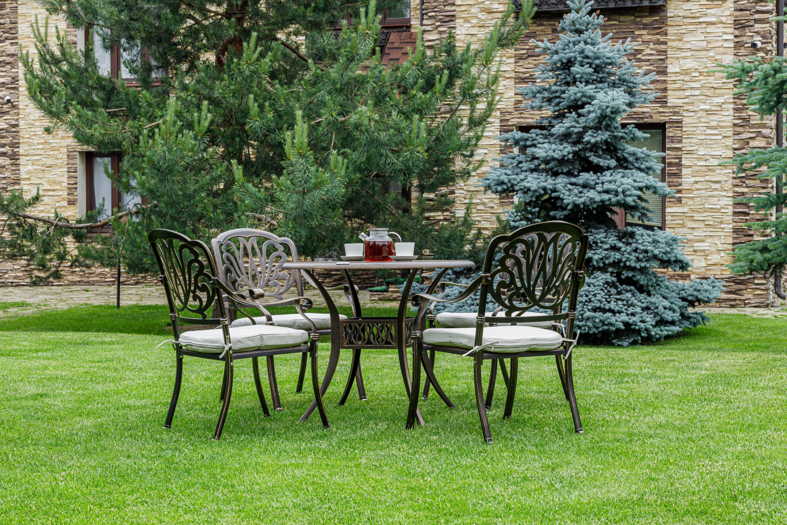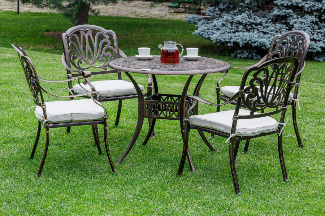 Комплектация и габариты: Кресло (4 шт) - 68х65х91 см Обеденный стол: Диаметр - 90 см Высота - 74 см Материалы: Материал каркаса – литой алюминий Материал столешницы – алюминий Материал чехла на подушки - олефин (водоотталкивающая ткань) Материал наполнителя подушек для сидения - поролон Цвет комплекта - бронзовый Цвет подушек – бежевый Дополнительная информация: Количество посадочных мест – 4 человека Максимальная нагрузка на посадочное место - 150 кг Чехлы съемные – да Накладки на ножки - да (пластиковые) Держатели и крепления подушек зависят от поставки и не являются неотъемлемой частью комплекта Гарантийный срок - 1 год Эксплуатационный срок - 10 лет Страна производитель - Китай