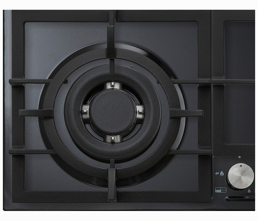 Газовая варочная панель 60см, 4 высокоэффективные конфорки, WOK- сверхмощная конфорка с тройным рядом пламени, автоматический электроподжиг, газ-контроль каждой конфорки, передние металлические переключатели, чугунные решетки, цвет- мат черный