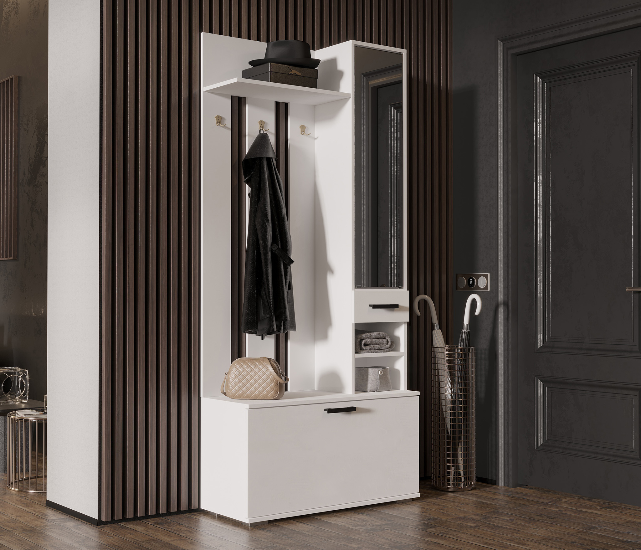 Прихожая стильно выглядит, несложно собирается, в комплекте все было.