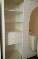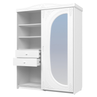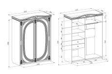 Шкаф-купе с зеркалом на фасаде. В левой части шкафа установлены три полки для сложенных вещей и два выдвижных ящика. Высота верхней полки 415мм, двух остальных — 324 мм. Высота боковых стенок каждого ящика 130 мм, ширина ящика 644 мм, глубина 500 мм. Ящики установлены на телескопических направляющих полного выдвижения. В правой части расположена штанга для одежных вешалок.