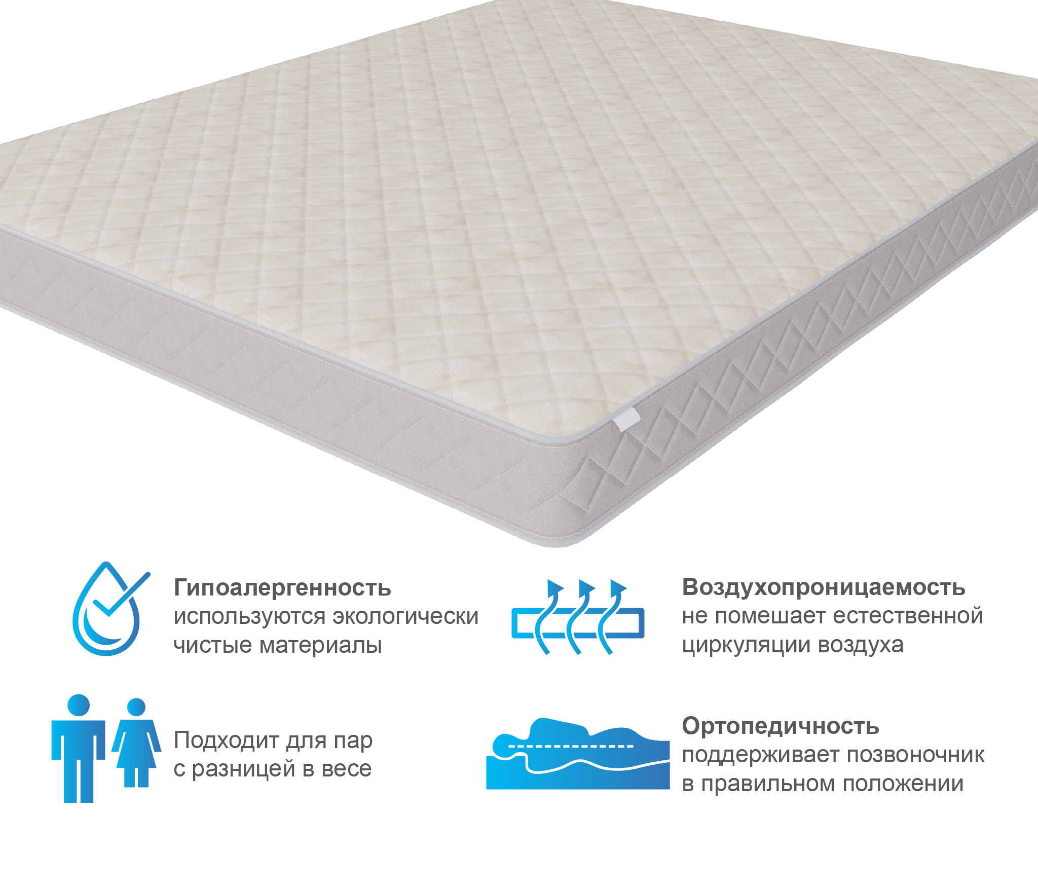 Матрас с ортопедическим эффектом из нашего каталога подходит для двуспальной кровати со спальным местом с широким размерным рядом. Для продления срока эксплуатации и сохранения первоначальных качеств рекомендуем использовать изделие совместно с защитным чехлом.