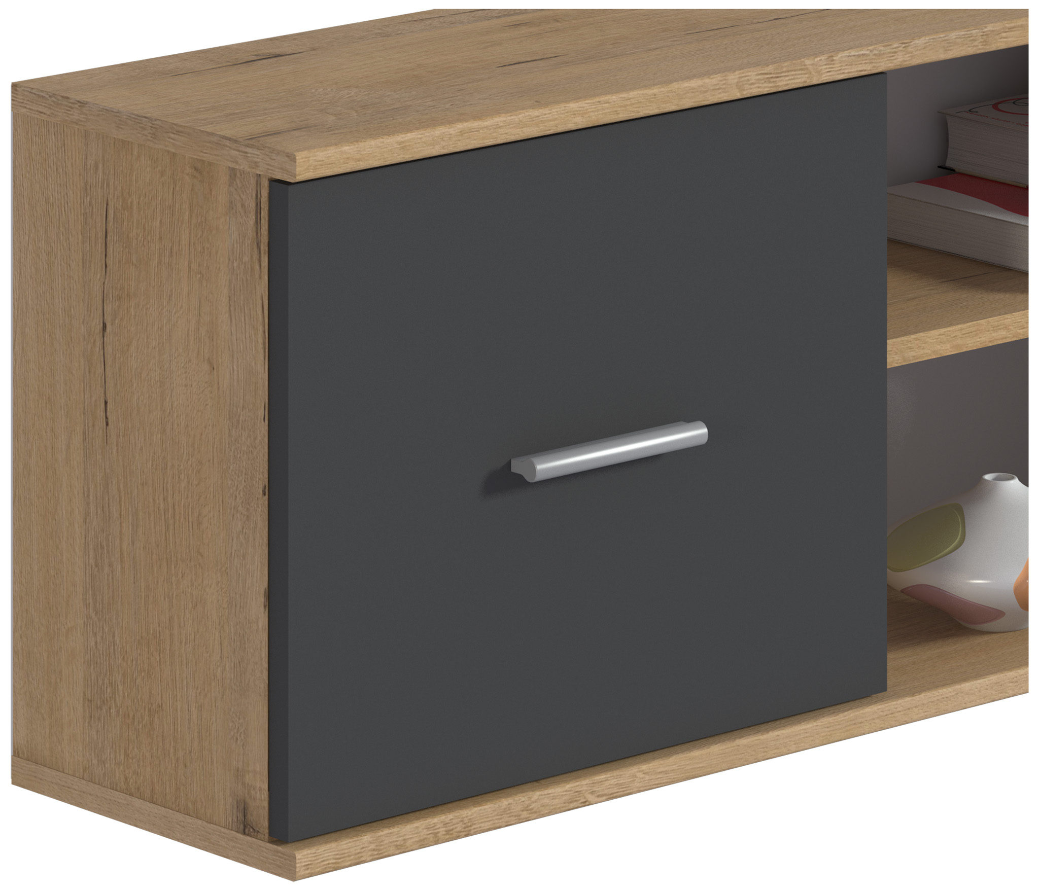 Габаритные размеры – ширина 103 см, высота 39 см и глубина 24 см. Полка состоит из двух открытых отделений, расположенных одно над другим и одного отделения за глухой дверцей.Выполнена полка из современного материала. .Полка крепится к стене при помощи дюбелей, которые входят в комплект.