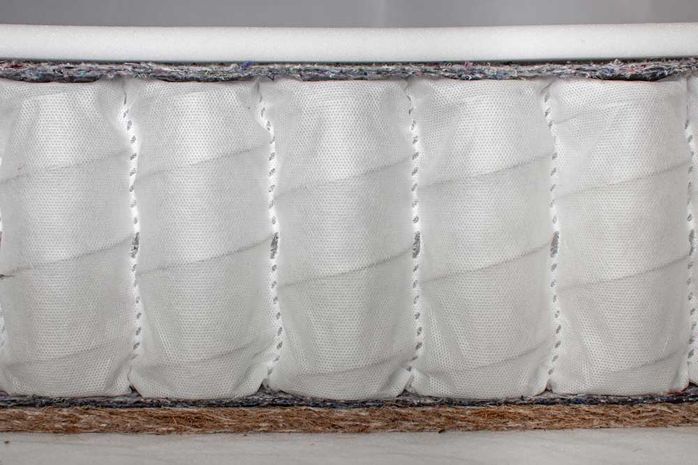 В основе данной модели - блок независимых пружин - TFK (250 пружин на кв.м.), где каждая пружина заключена в отдельный чехол из спанбонда. Такая конструкция предотвращает появление эффекта гамака, а так-же способна справится с разницей в весе спящих - более 25 кг. Внешние слои наполнителей матраса отделены защитным слоем войлока, который защищает материал от губительного воздействия, связанного с работой пружинного блока.