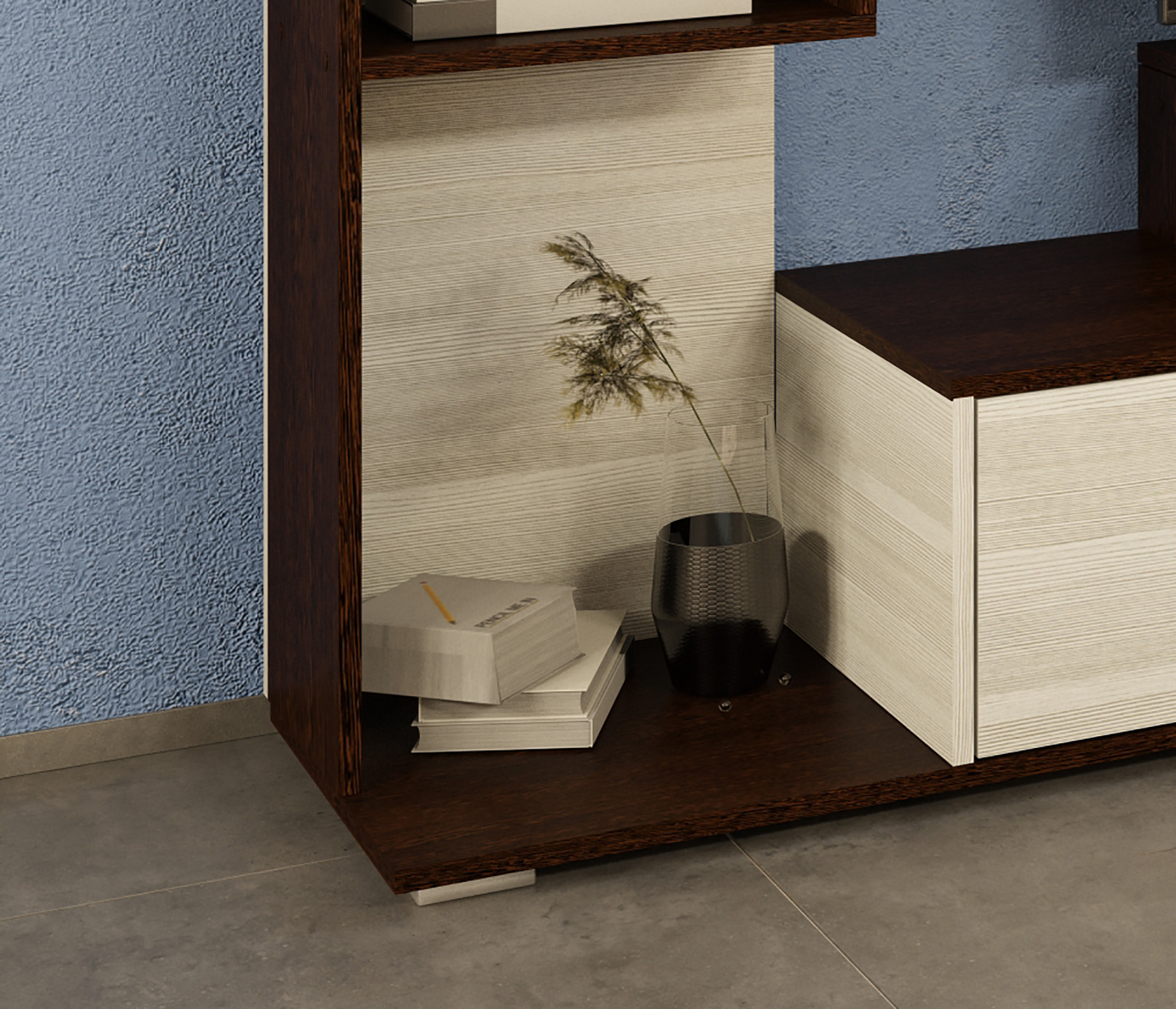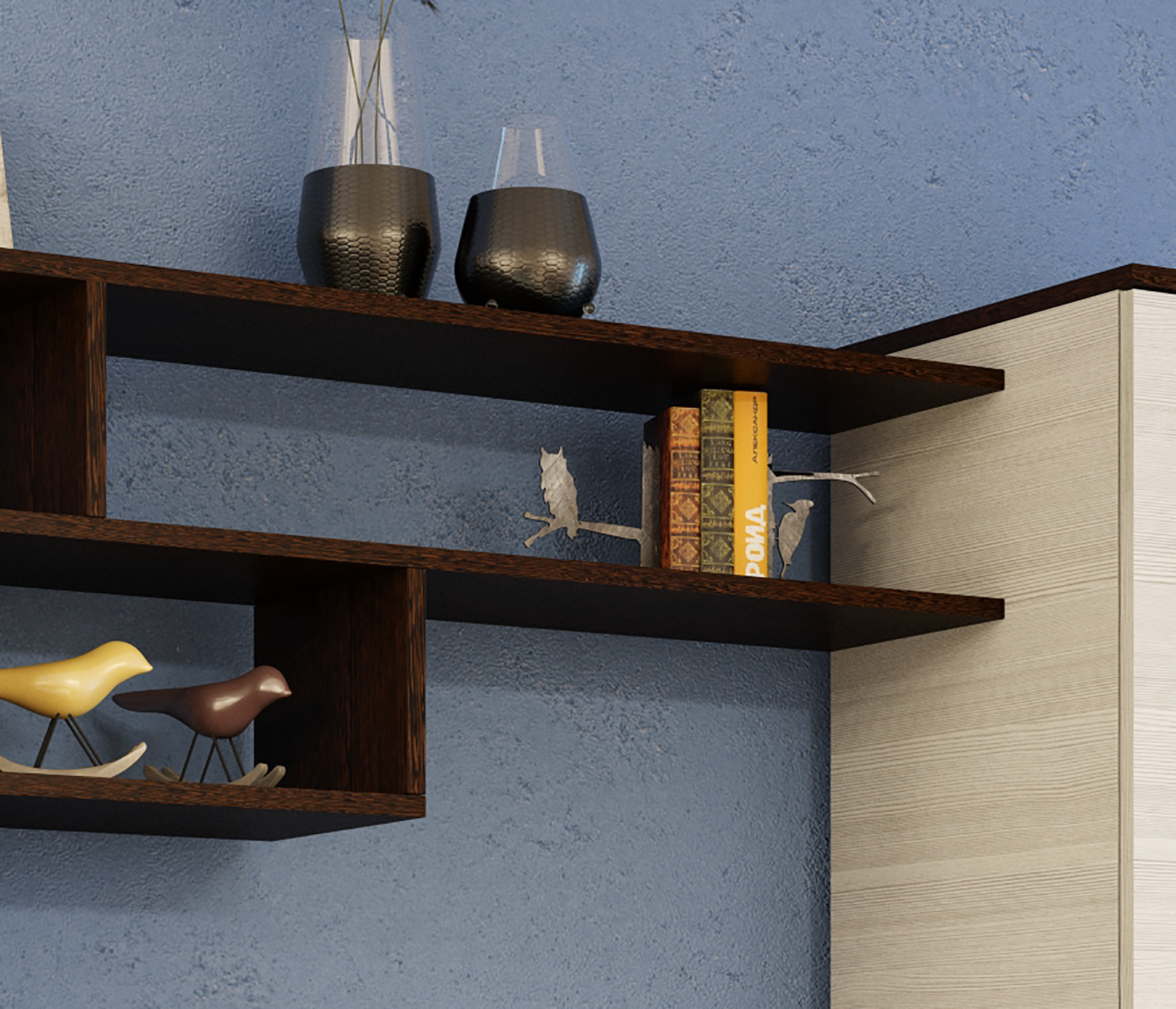 Конструкцией предусмотрен шкаф с полками для хранения одежды, постельного белья и других вещей. В основании располагаются открытые ниши и закрытые отделения. По периметру стенка имеет полки разных размеров для книг, фотографий, предметов интерьера и других мелочей.