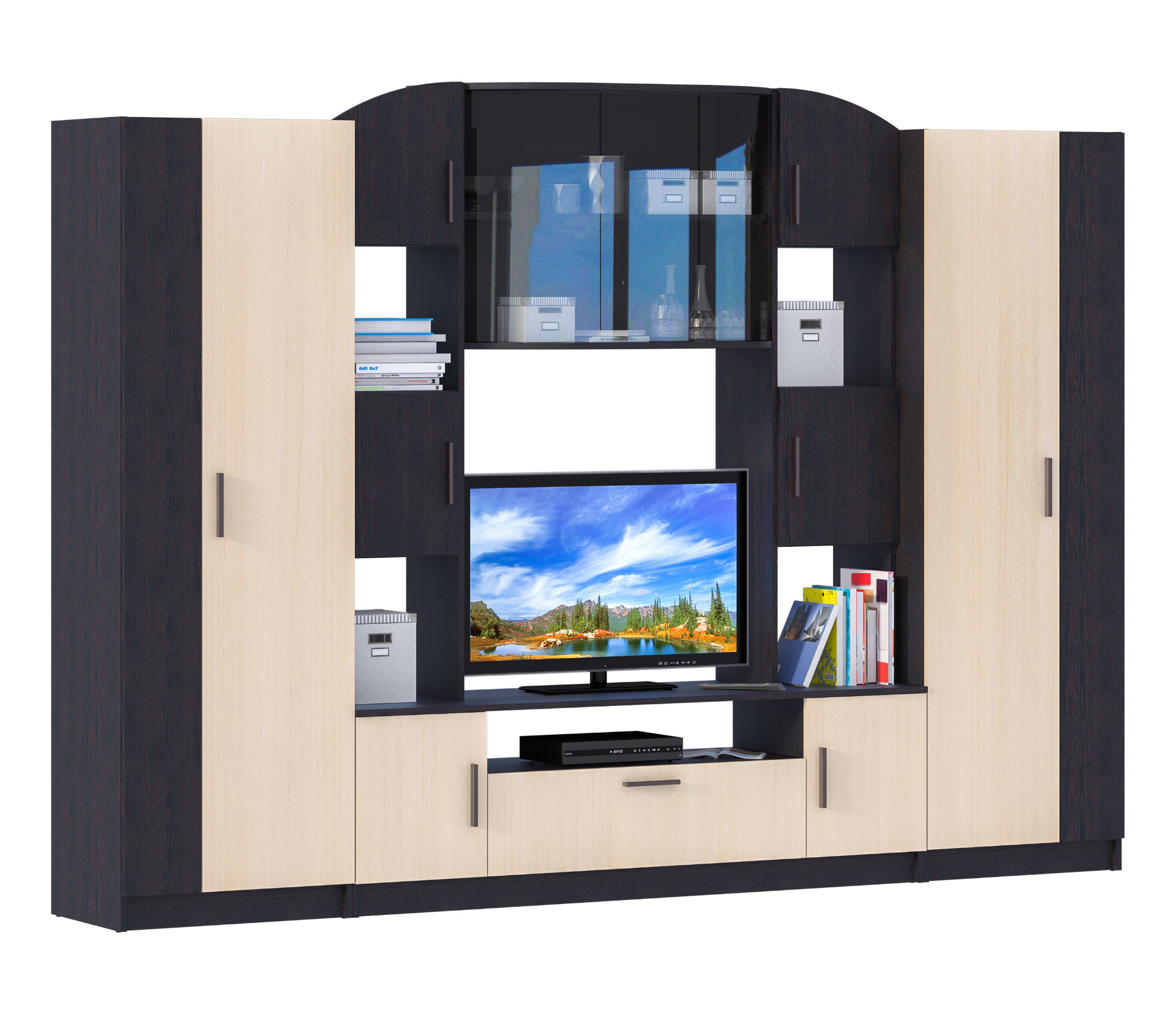 Стенка Макарена уверенно завоевала сердца наших покупателей. Стенка стильная и современная, выполнена в контрастном сочетании цветов корпуса и фасада. Большое количество различных отделений позволит Вам разместить все необходимые вещи и предметы декора. Элементы гарнитура гармонично объединяются и дополняют друг друга для создания более функциональной и комфортной комнаты. Идеальный вариант для обстановки небольшой гостиной. В комплект входит: витрина СБ-2615-01 с распашными дверцами, с открытыми и закрытыми полками, тумба ТВ СБ-2615-02 с распашными дверцами, шкаф 2х дверный СБ-2615-03 с антресолью и поперечной штангой, шкаф 2х дверный СБ-2615-04 с 4 мя полками.