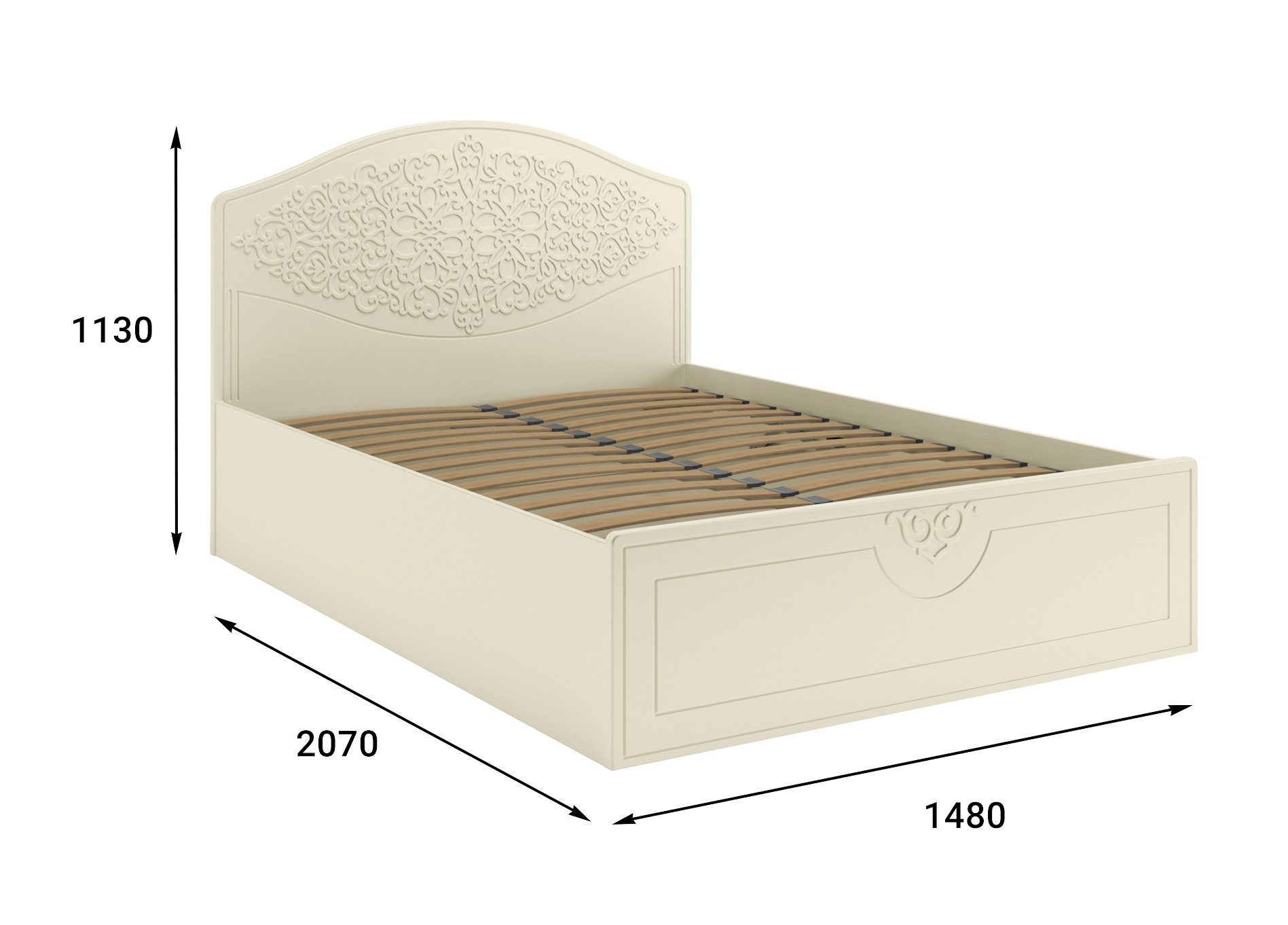 Материал корпуса/фасада: ЛДСП/МДФ. Цвет корпуса/фасада: ваниль/ваниль. Размеры модуля (д/ш/в) в мм: 2070х1479х1134. Высота изножья 420 мм. Основание кровати: ламели с подъемным механизмом. Особенности: короб для хранения постельного белья. Рекомендуемый размер матраса в мм: 1400х2000х200-230.