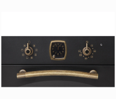 Духовой шкаф в ретро-дизайне, аналоговые часы в классическом стиле Frank Muller с функцией времени, таймера и отключения, 8 режимов нагрева, объем духовки 67 л, телескопические направляющие на одном уровне, трехслойное остекление, каталитическая самоочистка, автоматическое отключение, в комплекте: 2 противня, хромированная решетка, стеклянный противень, цвет - черный; цвет ручек - бронза