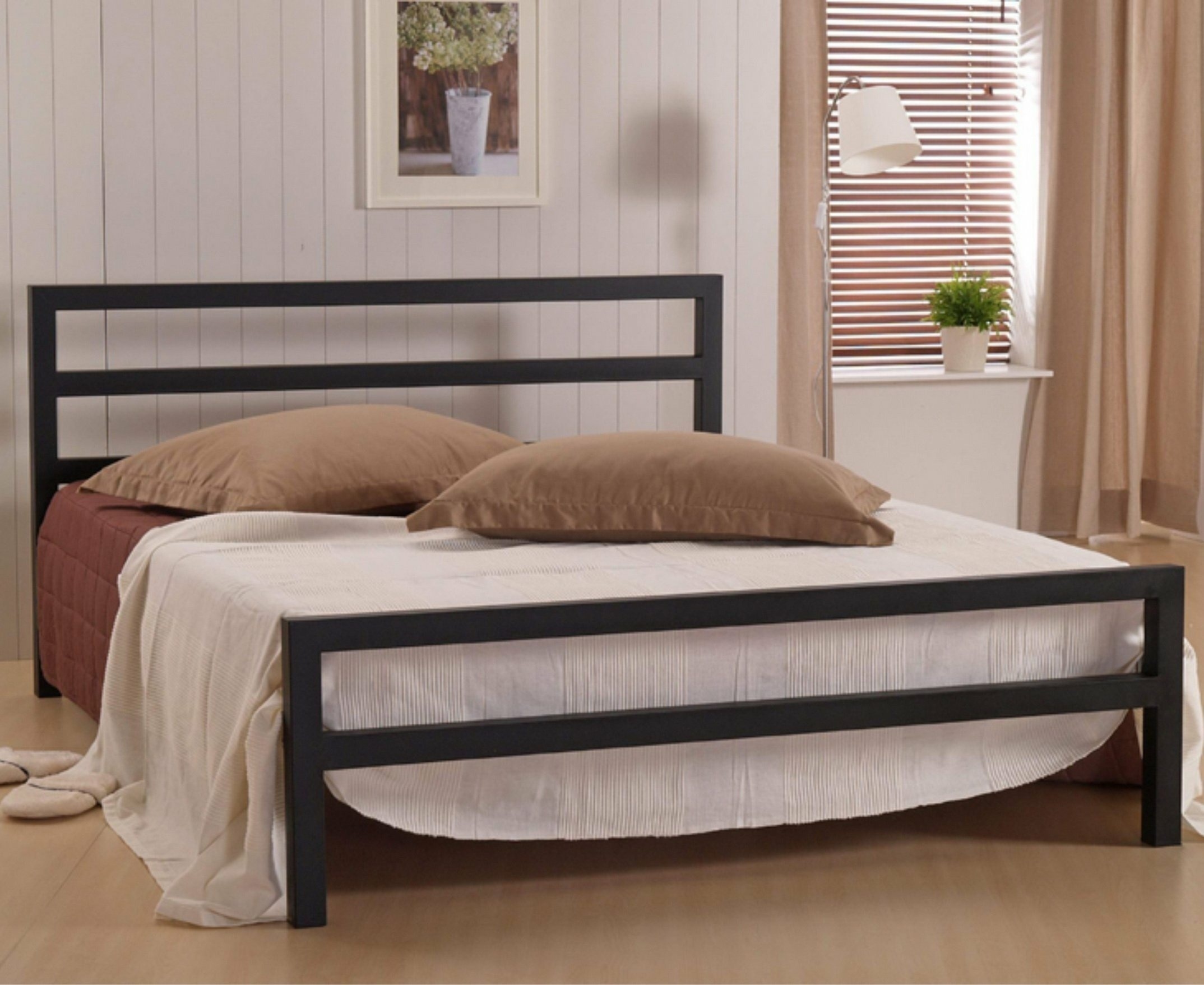 Благодаря отсутствию сплошного полотна изголовья и основания и его замены на горизонтальные перекладины модель выглядит изящно и совершенно не громоздко, благодаря чему может гармонично дополнить любой интерьер в современной стилистике.