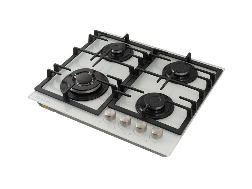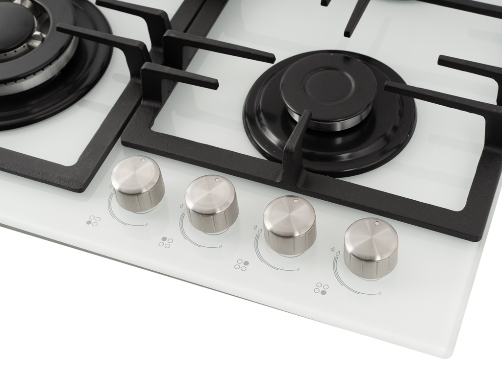 Газовая варочная поверхность закалённое стекло, Ширина 60 см, 4 газовые конфорки, 1 экономичная конфорка (0,9 кВт), 2 стандартные конфорки (1,7 кВт), 1 ВОК конфорка(3,5 кВт), Автоподжиг, Чугунные решетки, Жиклёры для баллонного газа, Газ-контроль, Цвет: белое стекло.