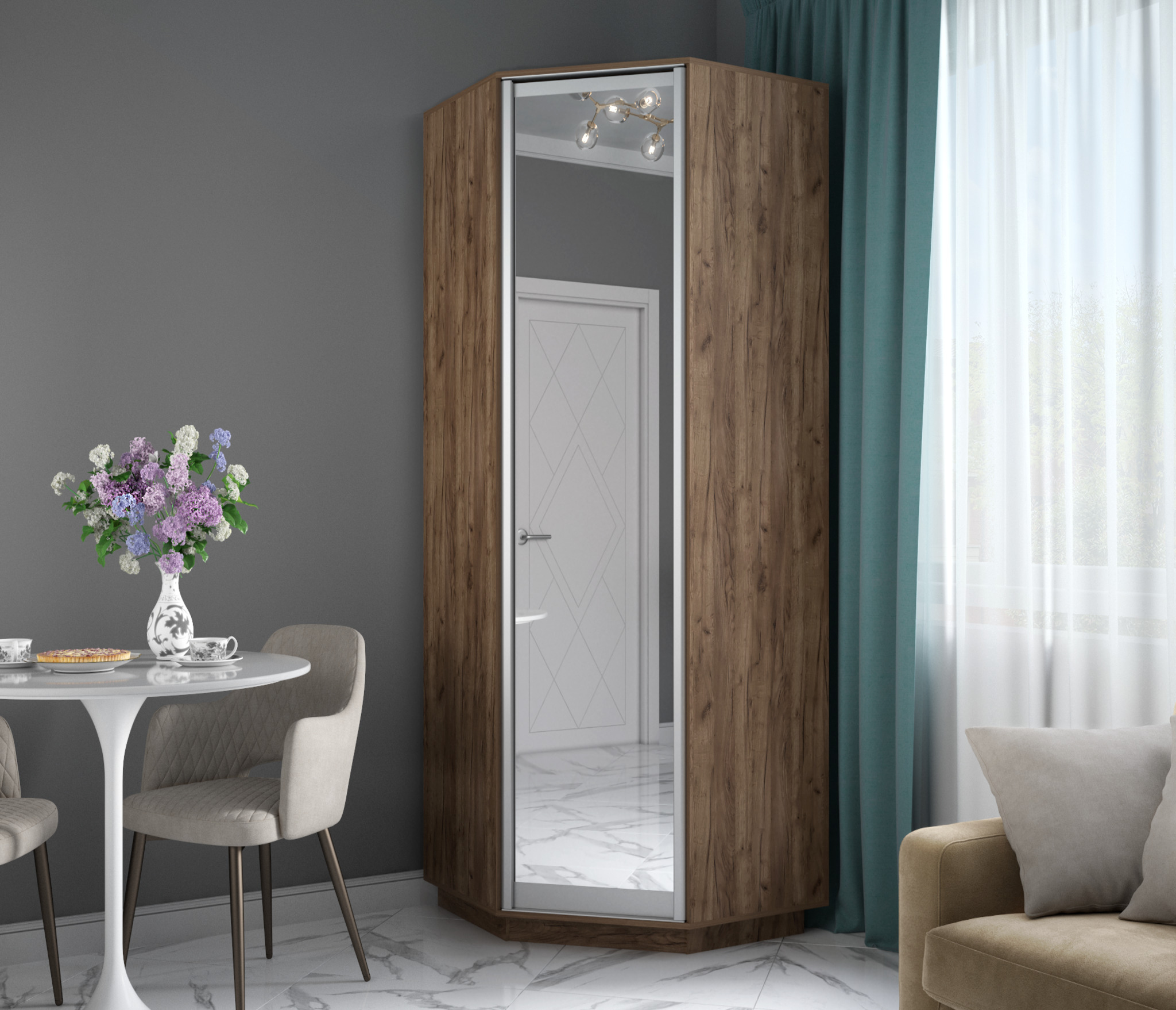 Лаконичный дизайн: монолитный трехпанельный фасад с распашной дверью украшает полноразмерное зеркало в алюминиевом профиле;