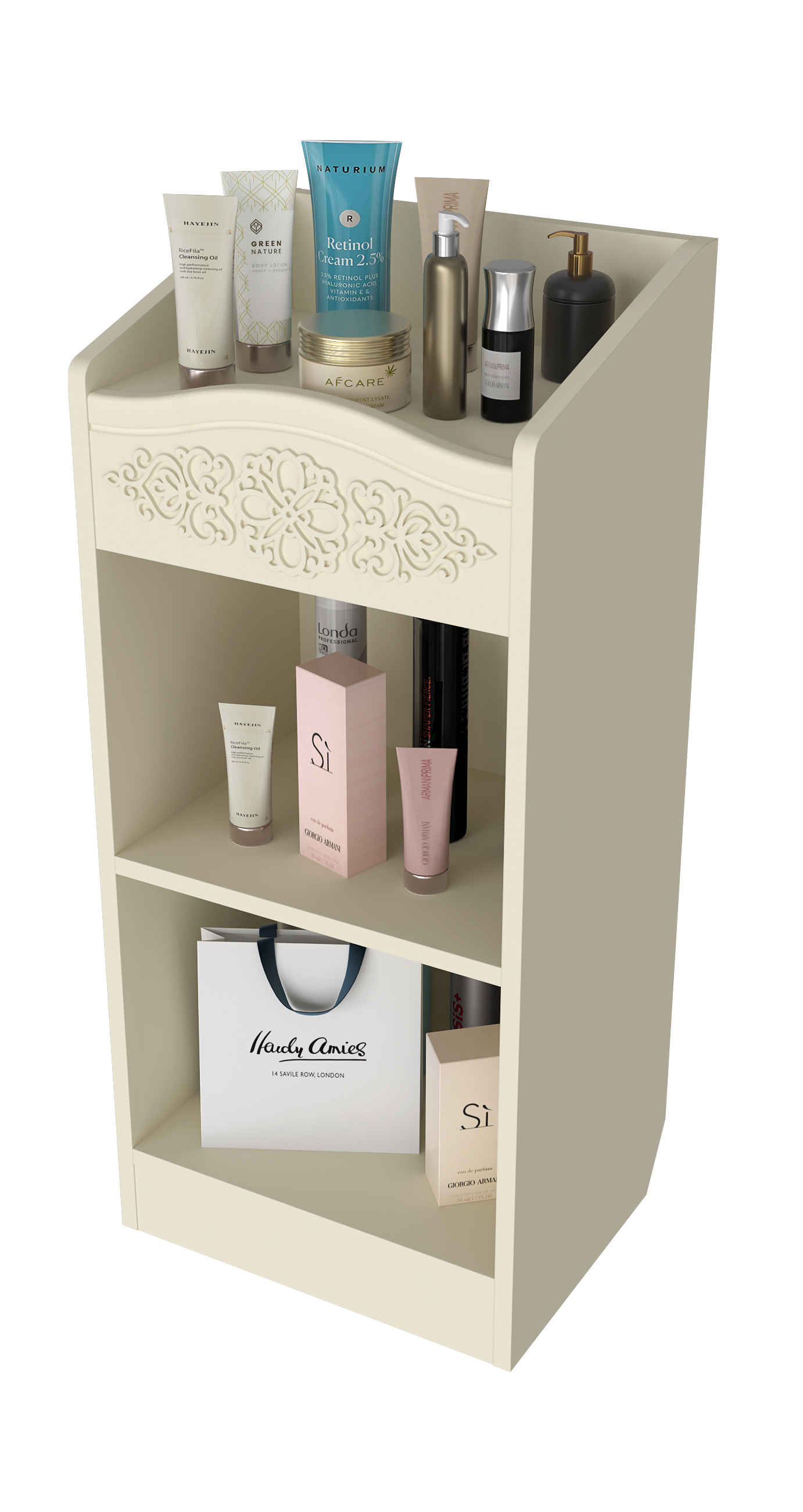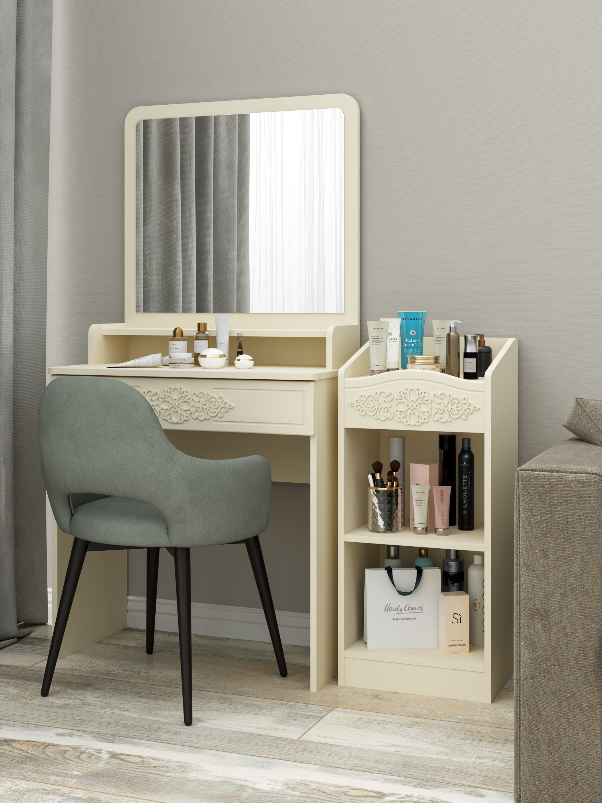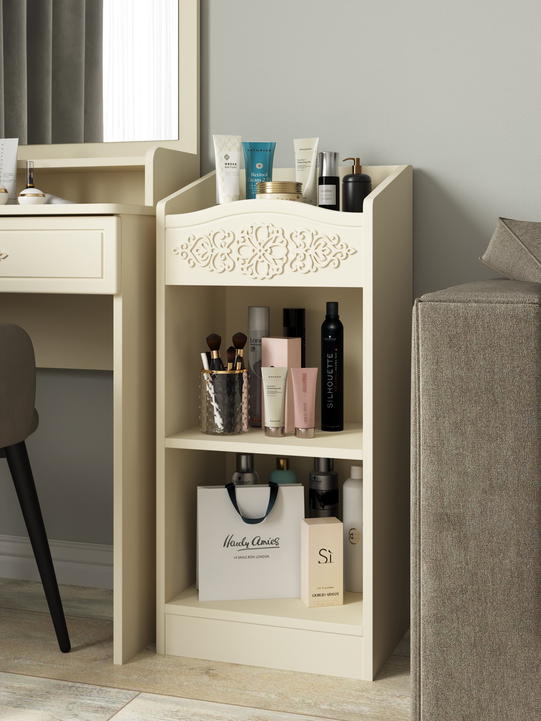 Шкаф АС-66 прекрасно дополнит ваш туалетный столик, создав дополнительное место для хранения книг, парфюмерии и разных аксессуаров. Мебель изготовлена из качественной ламинированной ДСП 16 мм. В оформлении фасадов МДФ применяется уникальная технология нанесения объемного узора 3D.