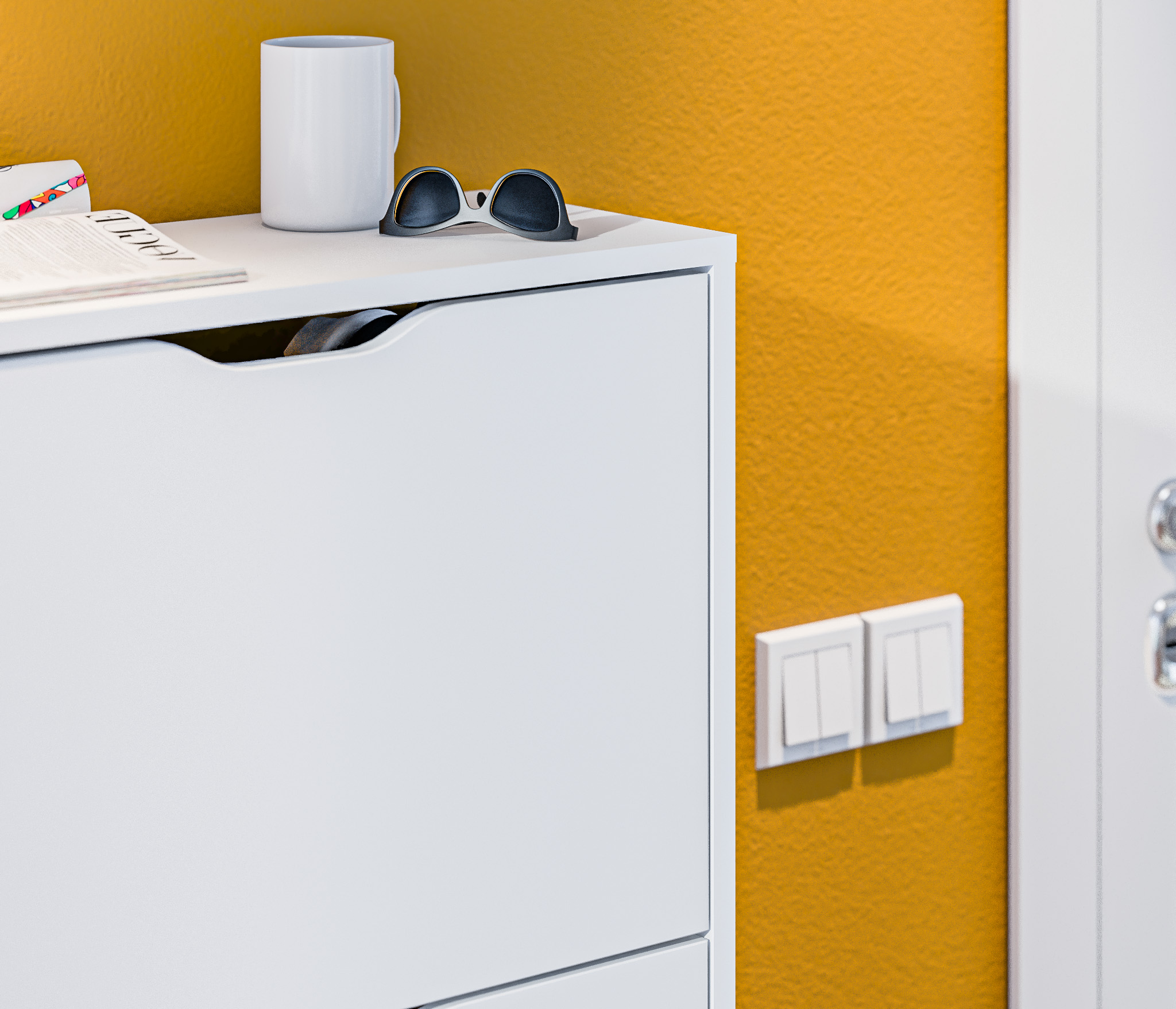 Габаритные размеры – ширина 59 см, высота 126 см и глубина 25 см. Обувница имеет три отделения, каждое из которых оснащено специальными стойками для хранения обуви. Прорезные ручки и строгие геометрические формы позволяют вписать обувницу в любой интерьер. Обувница произведена из экологичного прочного КДСП, устойчивого к мелким механическим повреждениям.