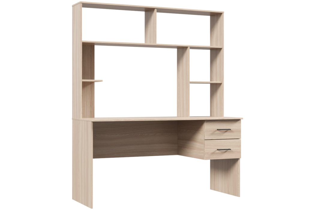 Письменный стол поможет создать комфортное пространство для учебы и работы. Модель представляет собой стол с надстройкой, объединенные в функциональную и эргономичную композицию. В ящиках и на полках удобно хранить учебные принадлежности, книги, канцелярию. На столешнице достаточно места для монитора, клавиатуры, пары небольших колонок. На верхней открытой полке будут выгодно смотреться предметы декора.