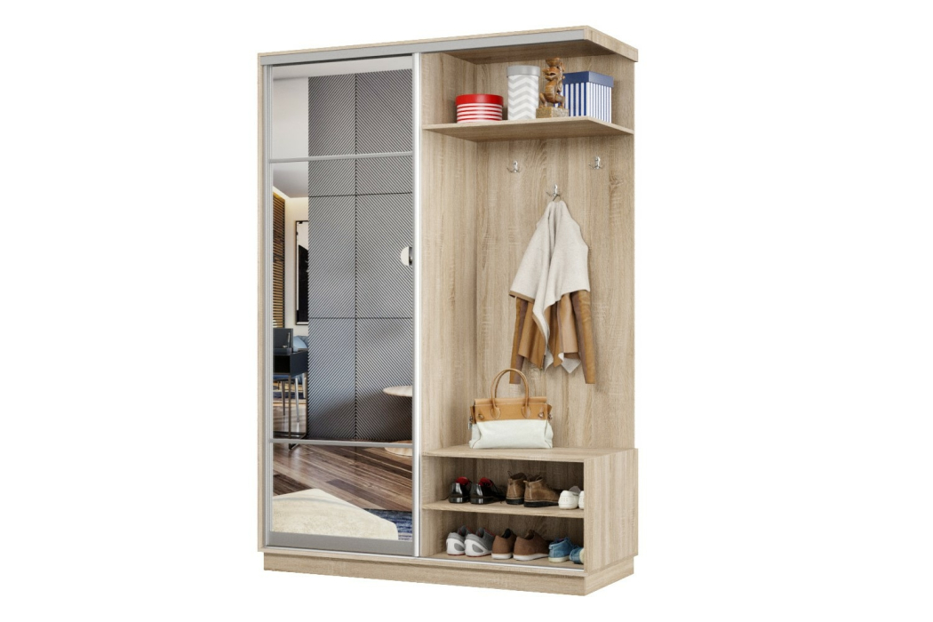 За счет применения системы купе прихожая отлично зарекомендовала себя в узких коридорах, где распашная дверь ограничивает пространство. Несмотря на небольшие габариты, прихожая-купе получилась функциональной и практичной.