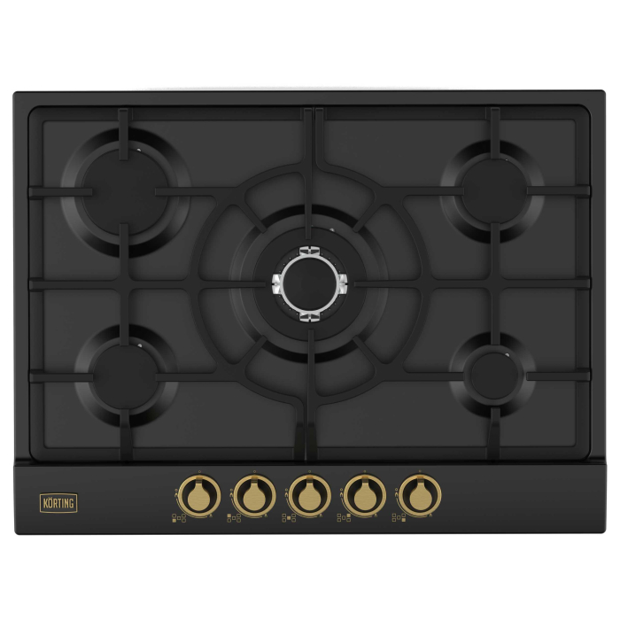 Газовая варочная панель 70 см в ретро-дизайне, 5 высокоэффективных конфорок, сверхмощная конфорка WOK 3,8 кВт, автоматический электроподжиг, газ-контроль каждой конфорки, чугунные решетки, металлический шильд с логотипом Korting, в комплекте - чугунная подставка WOK и адаптер для кофейника, цвет - черный, цвет регуляторов - золото.