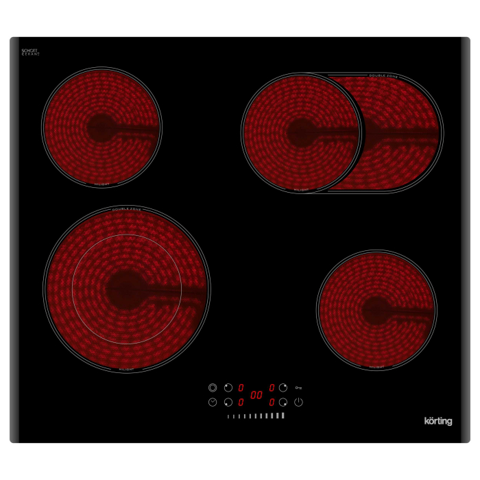 Стеклокерамика, ширина 60см, сенсорное управление Slider Touch, 4 зоны нагрева, 1 конфорка с двойной круглой зоной расширения, 1 конфорка с двойной овальной зоной расширения, таймер, LED индикация для каждой зоны, индикация остаточного тепла, автоматическое отключение, функция "Защита детей", цвет - черный, дизайн рамки - 2 скошенных края.