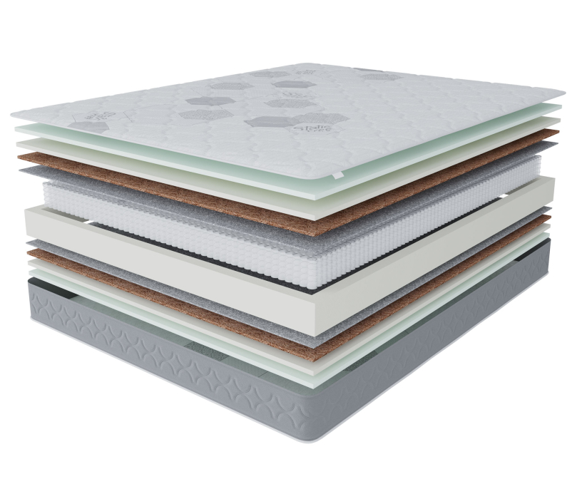 С обеих сторон матраса в качестве комфортного слоя используется 2 см искусственного латекса, этот материал очень долговечный и упругий, благодаря этому слою на этом матрасе будет одинаково комфортно людям разных весовых категорий. Для распределения нагрузки и придания необходимой жесткости используется латексированный кокосовый лист, который кладется под латекс. В основе матраса лежит блок независимых пружин, благодаря которому матрас будет индивидуально подстраиваться под каждого спящего и оказывать обратное давление только там, где это действительно необходимо. Чехол матраса сделан из плотного мягкого трикотажа, который стегается на 15 мм пене и синтепоне, что добавляет не много мягкости. Обращаем ваше внимание на то, что любой матрас отвечает за правильность положения во время сна нижнего и среднего отделов позвоночника, а за правильность положения шейного отдела отвечает правильно подобранная ортопедическая подушка. Рекомендуем использование с защитным чехлом AquaStop. |