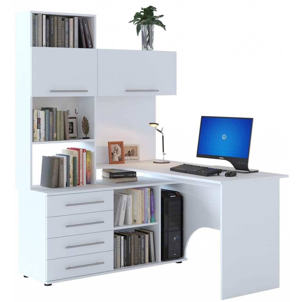 Стол КСТ-14Л белый левый; ЛДСП. Высота столешницы 74,5см. Рабочее место - 135х60см. Толщина ЛДСП - 16мм. Имеется 4 выкатных ящика на роликовых направляющих, 2 дверцы с подъёмными газлифтами. Огромная вместительность для учёбы