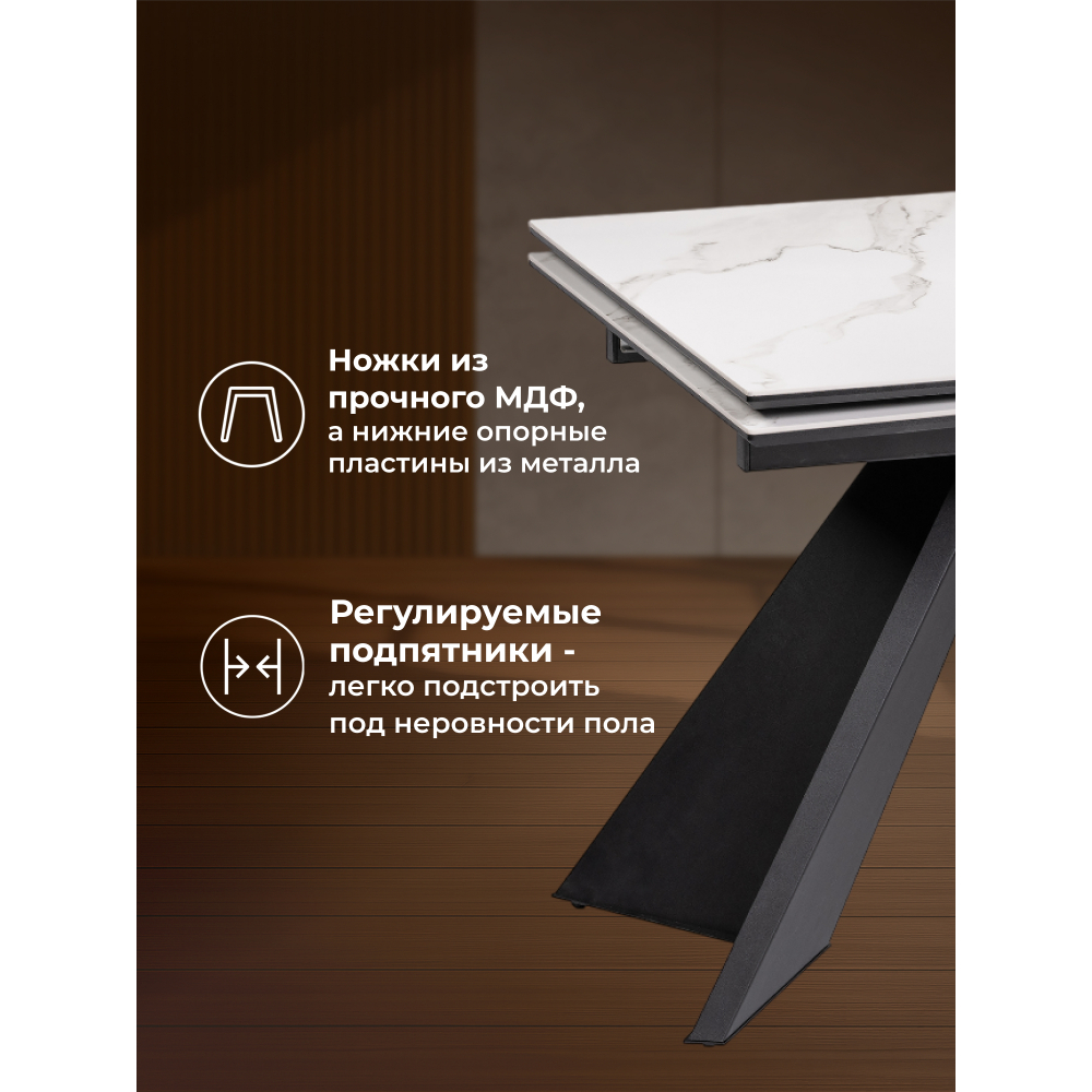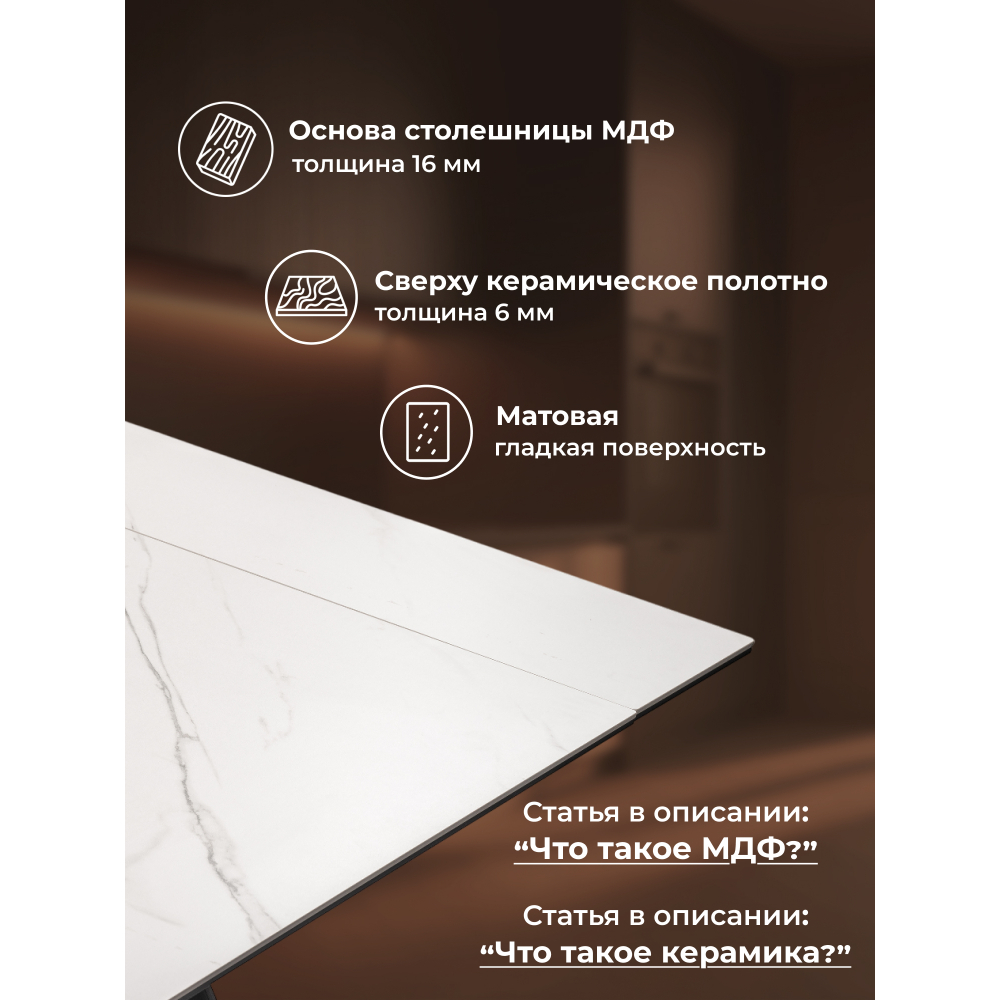 В целом, керамический стол Ливи сочетает в себе прочность, долговечность, эстетичный внешний вид и функциональность, что делает его отличным выбором для обустройства кухни или столовой.