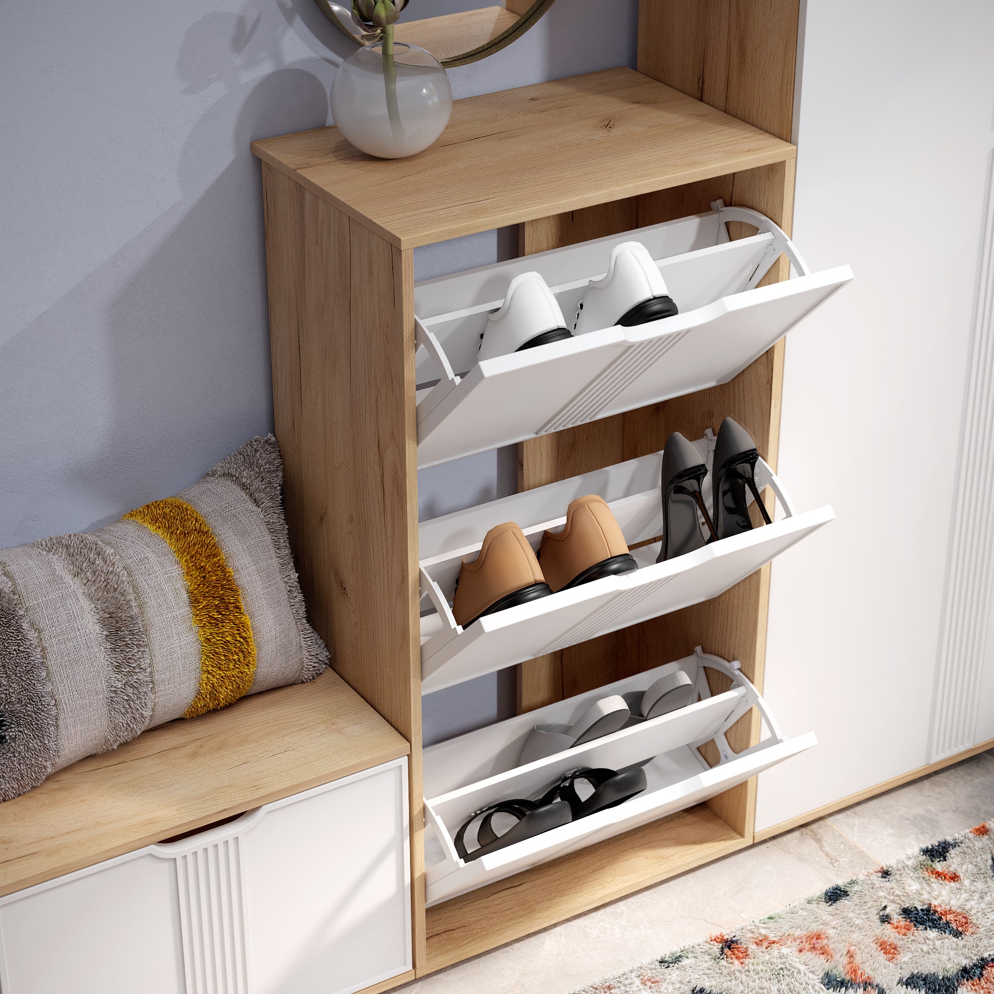 Тумба для обуви Эмилия ЭЛ-43 поможет создать уютную атмосферу в вашей прихожей. Изделие навсегда решит проблему разбросанной обуви по всему коридору. Тумба оснащена тремя отделениями со специальными отсеками для хранения обуви. Свес крышки в 30 мм обеспечит прилегание к стене с любым плинтусом. Высота опоры 20 мм.